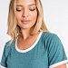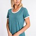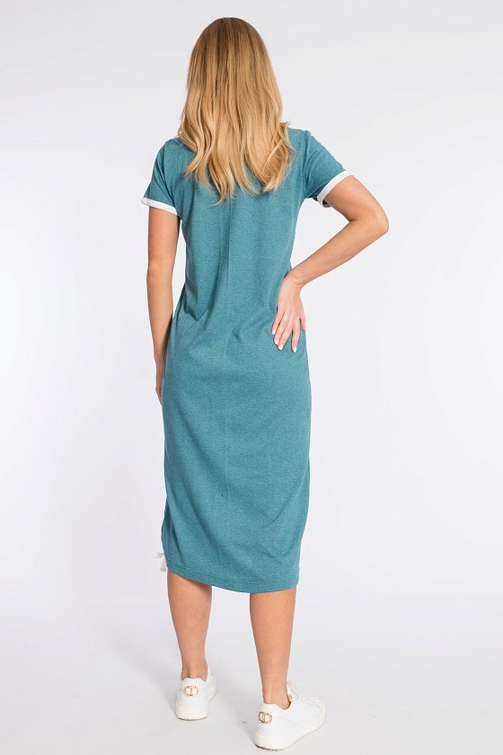 Платье прямого силуэта с разрезом внизу выполнено из хлопкового полотна. Короткие рукава и вырез горловины обработаны бейкой контрастного цвета.