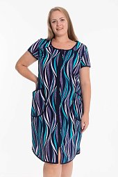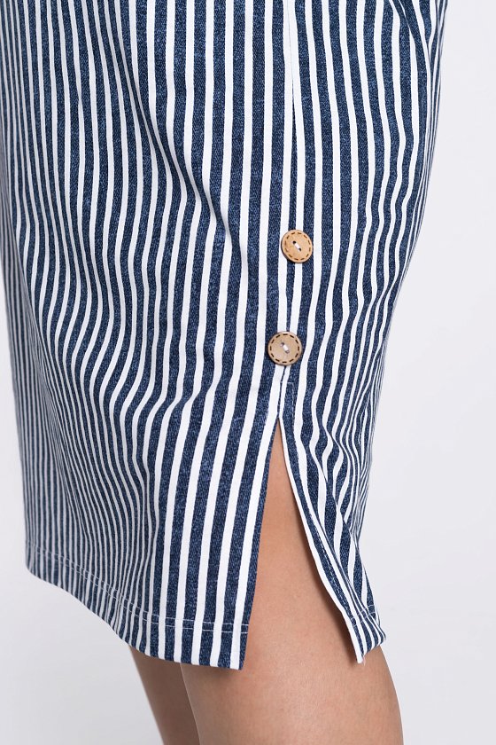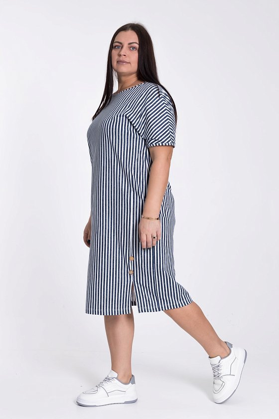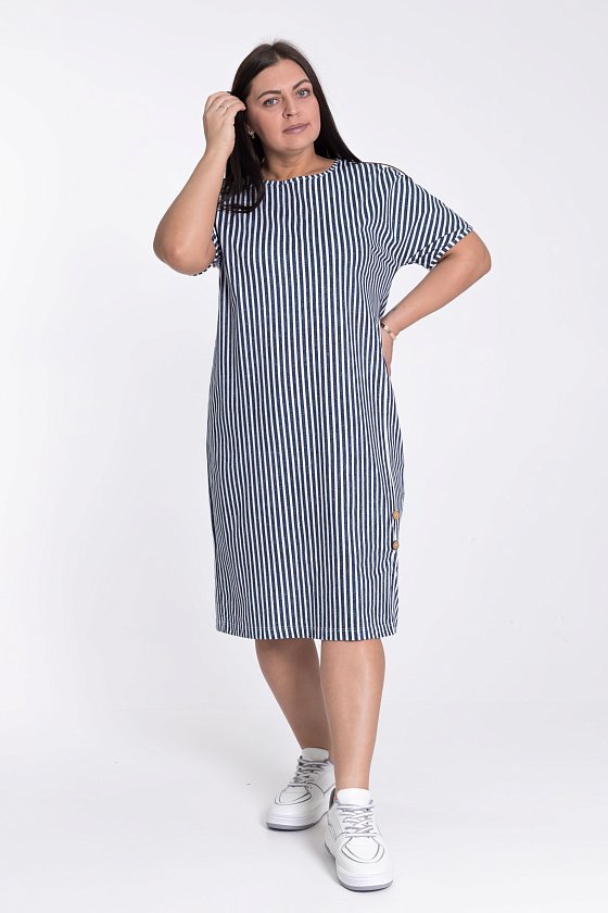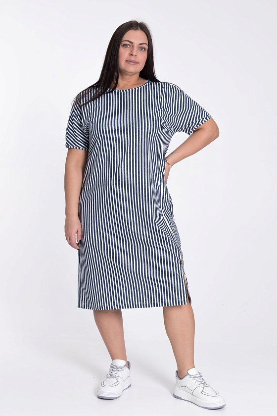 Платье из х/б полотна в вертикальную полоску, что зрительно делает силуэт фигуры стройным.