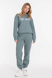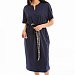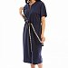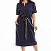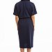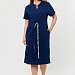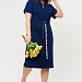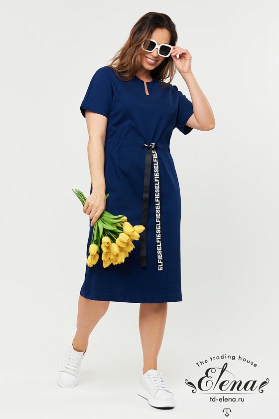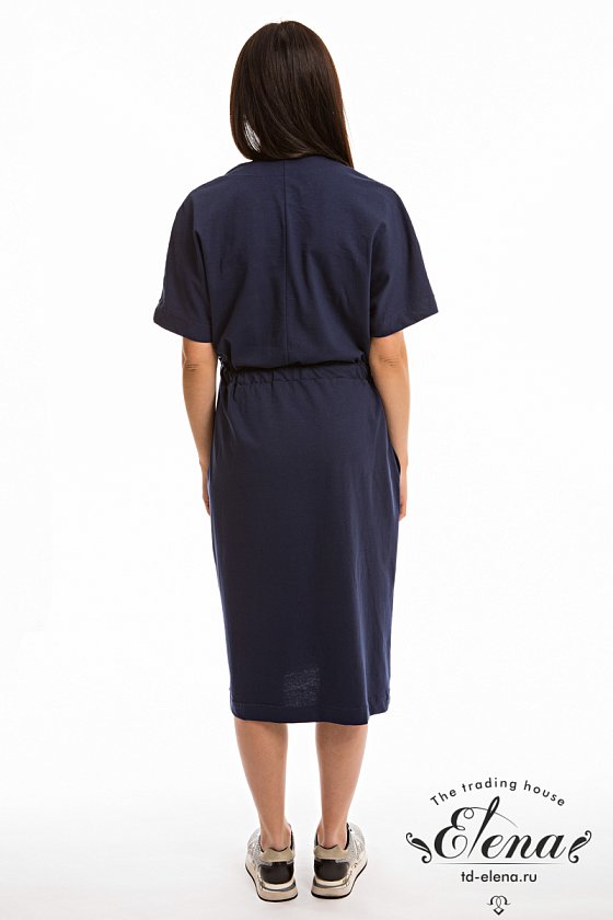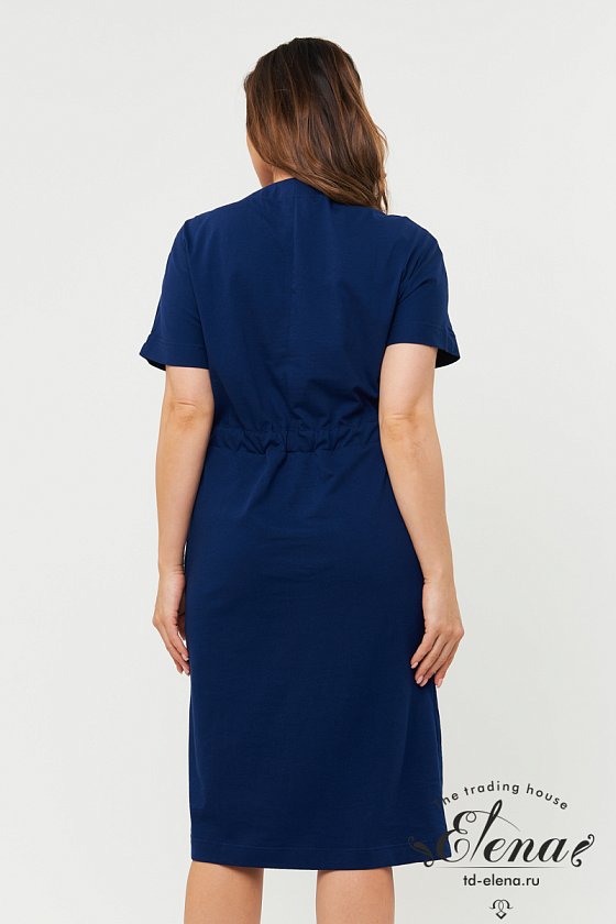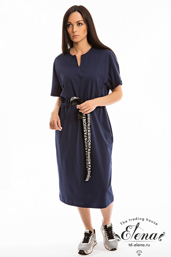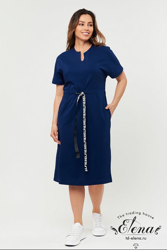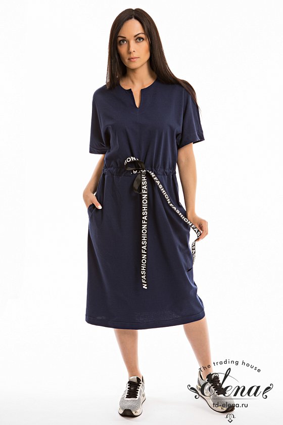 Платье выполнено из х/б полотна. Вырез горловины фигурный, рукава короткие. В кулисе по талии вставлена тесьма с надписью. По бокам размещены карманы.