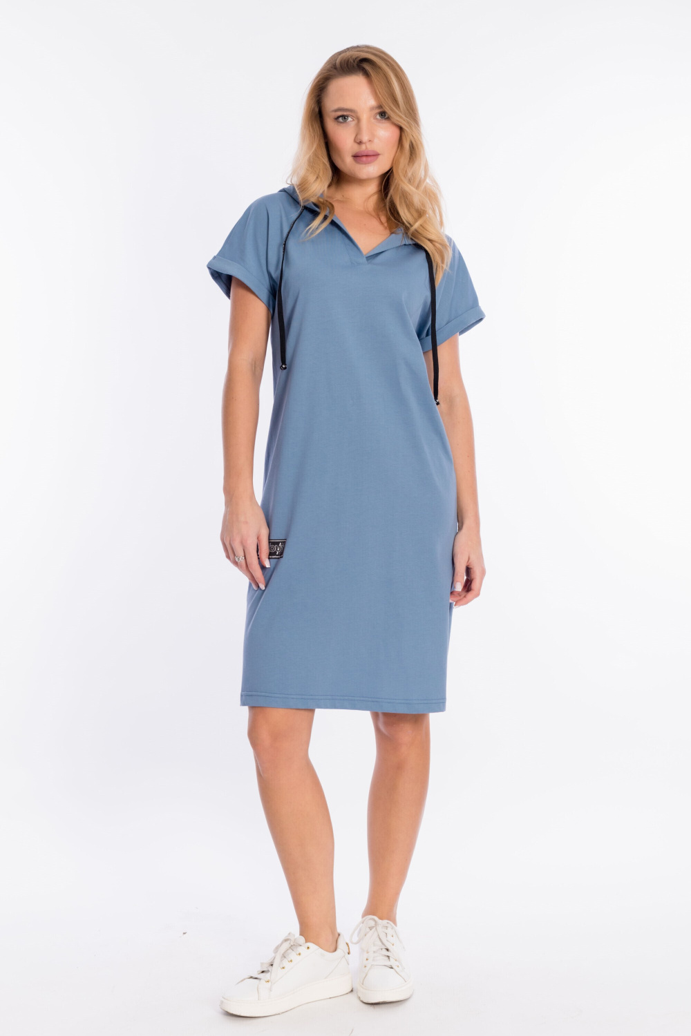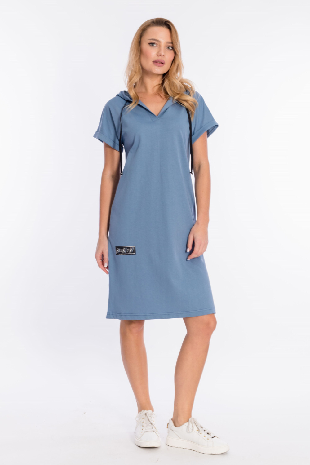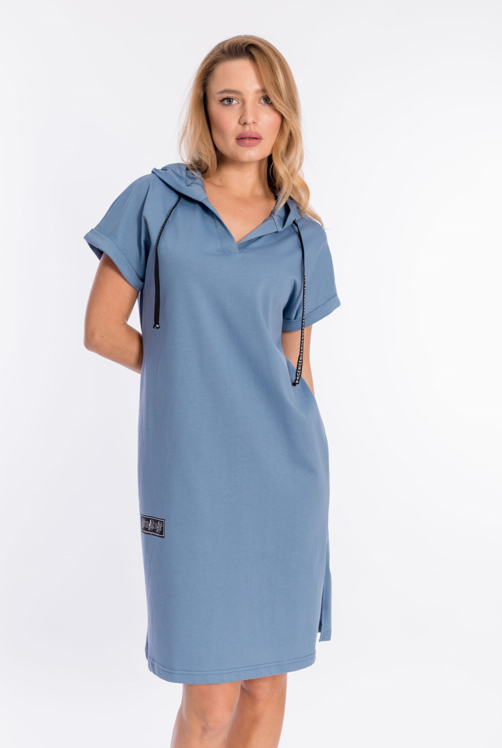 Платье выполнено из плотной однотонной кулирки. Ширина капюшона регулируется при помощи шнура. Линия плеча спущена, рукава короткие, манжета с отворотом. С левой стороны, снизу, расположен небольшой разрез, с правой принт.