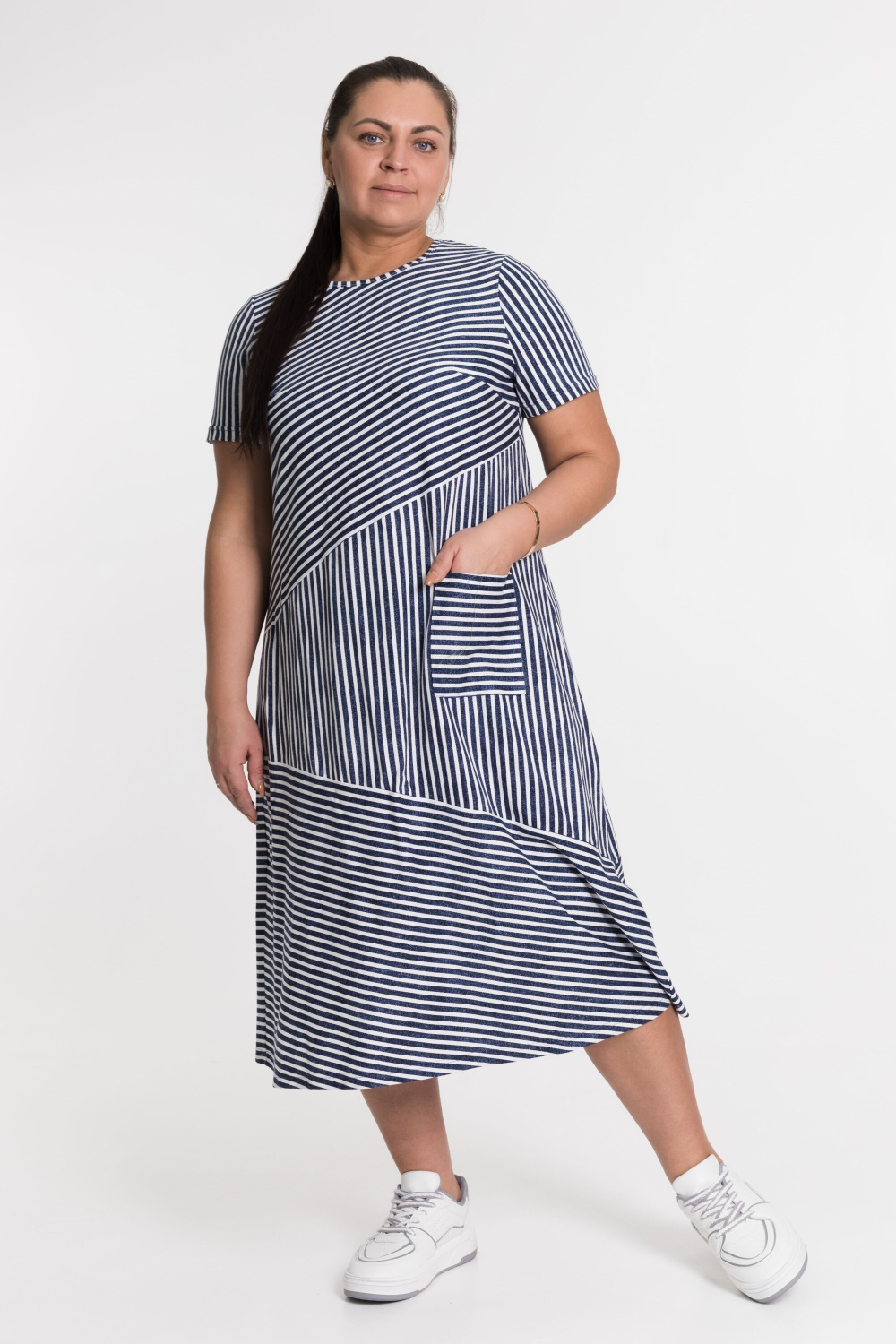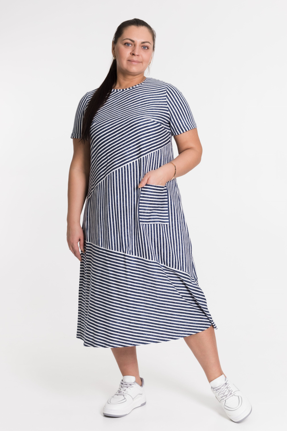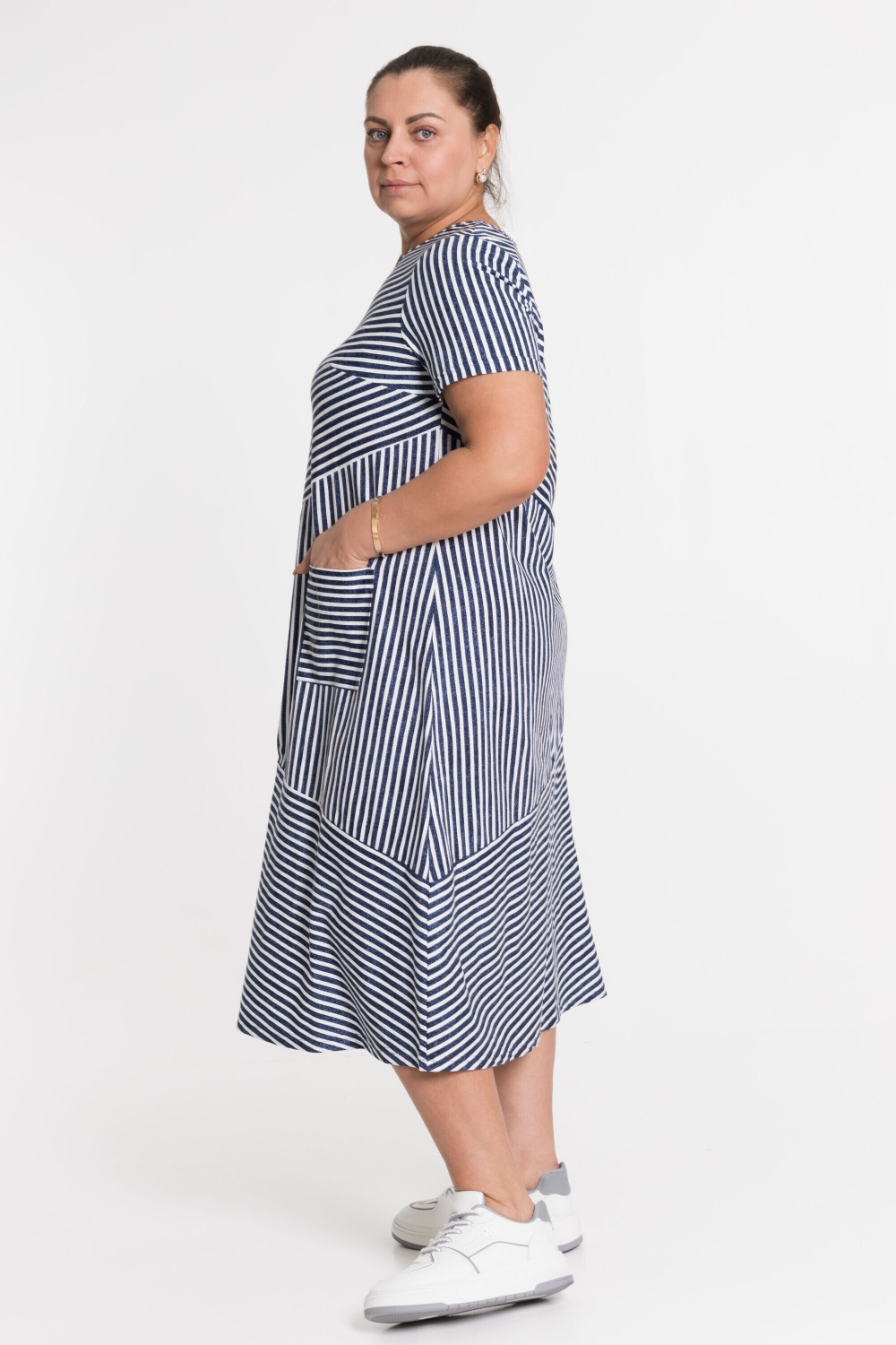 Платье в полоску с коротким рукавом - резное с разным направлением полоски, с левой стороны накладной карман.