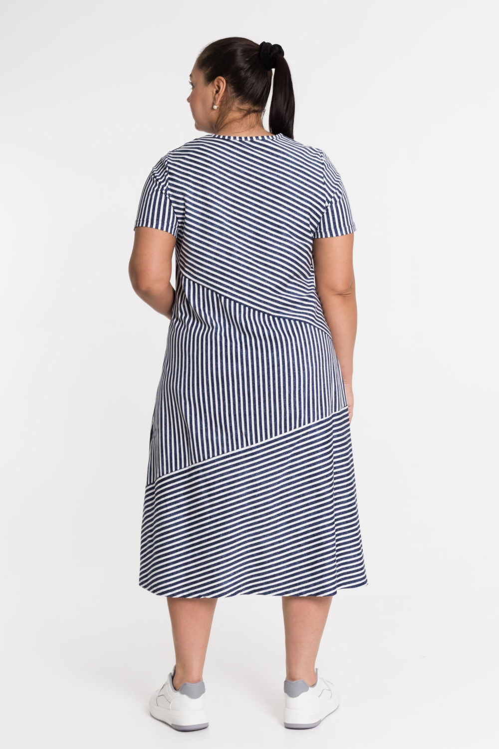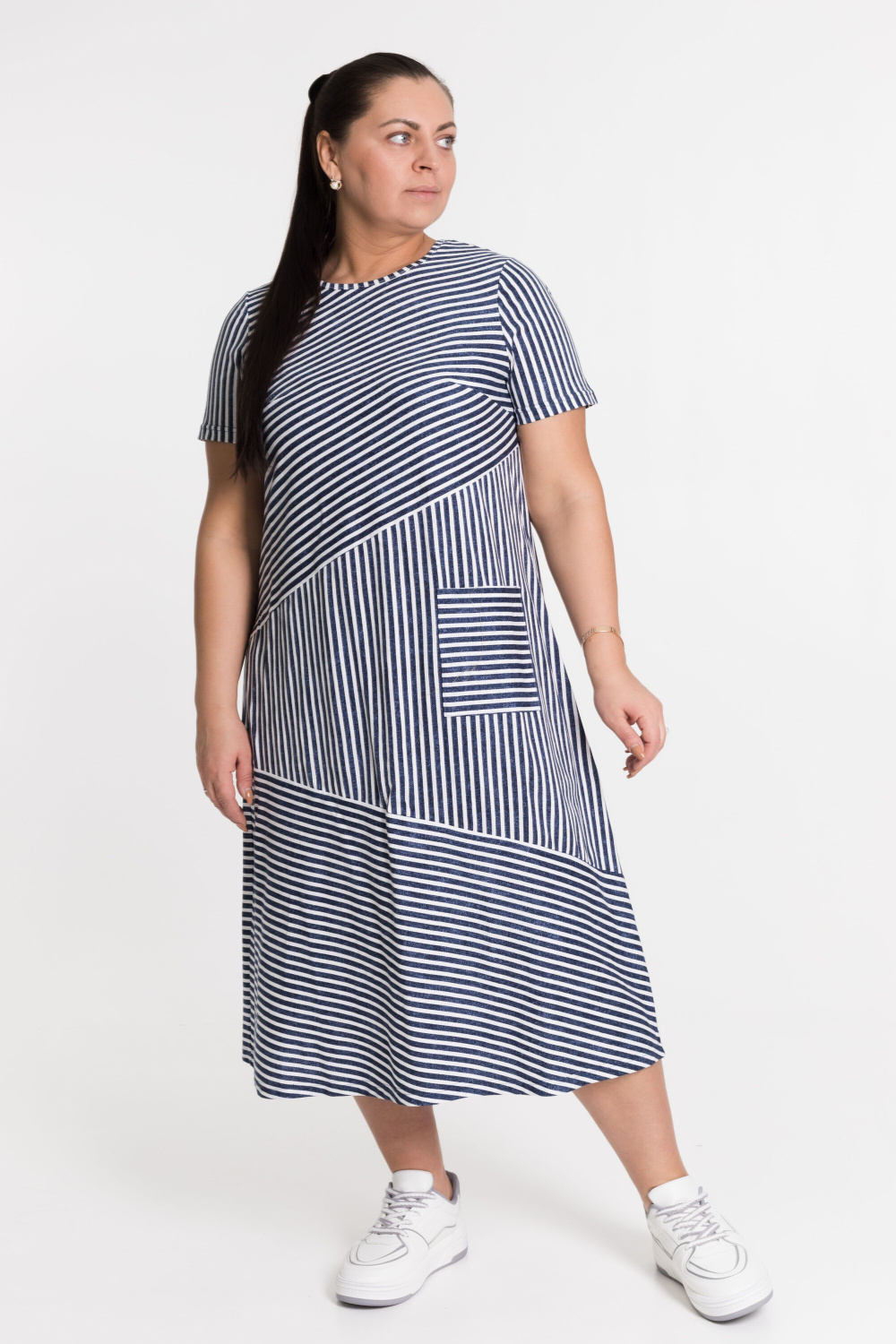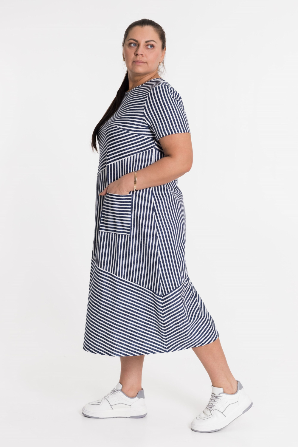 Платье в полоску с коротким рукавом - резное с разным направлением полоски, с левой стороны накладной карман.
