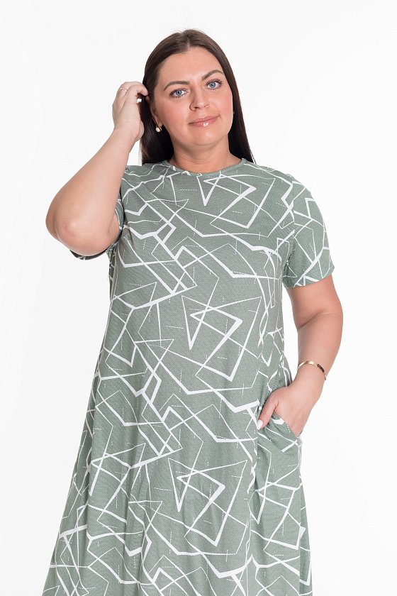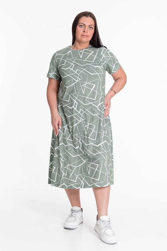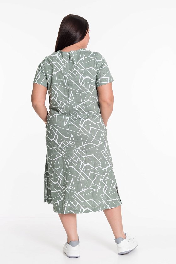 Платье из х/б полотна. По бокам разрезы, карманы в боковых швах, горловина обработана бейкой из основного полотна.