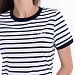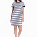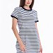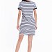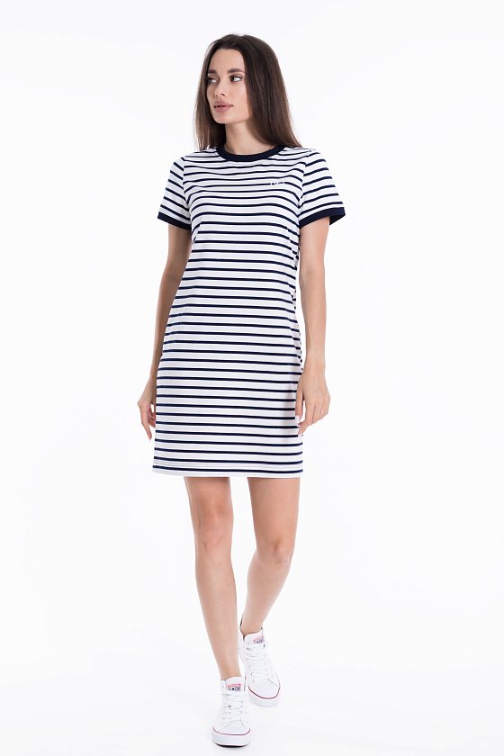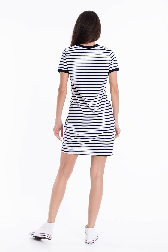 Летнее платье облегающего силуэта. Круглый вырез горловины и низ рукавов оформлены планками. Спереди термопечать.