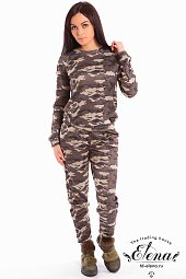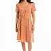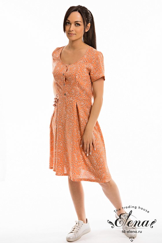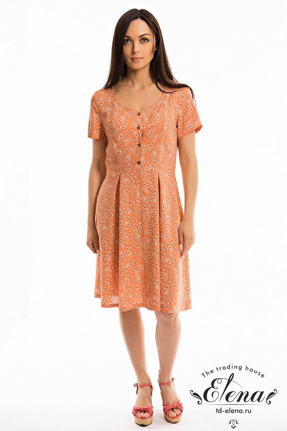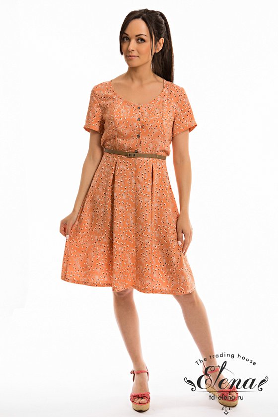 Платье выполнено из штапеля с набивным рисунком. Короткий рукав, спереди до пояса застёжка на пуговицы. На юбке, по линии талии заложены складки.