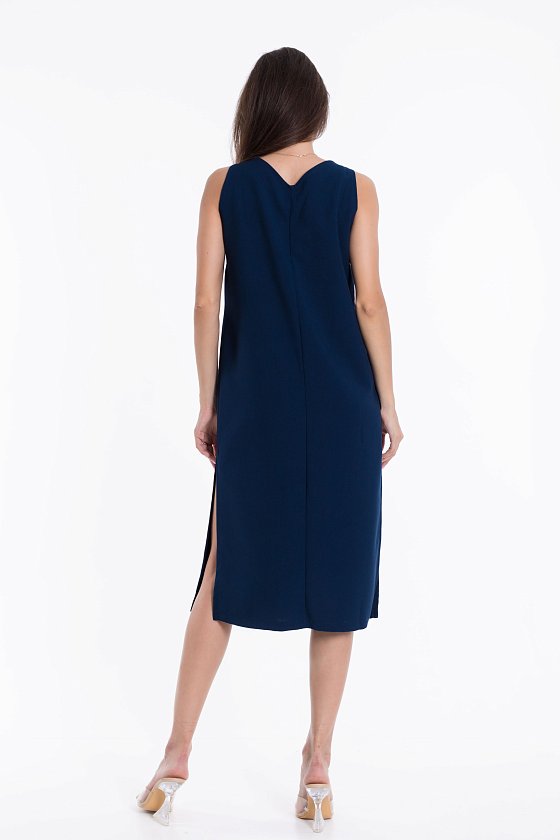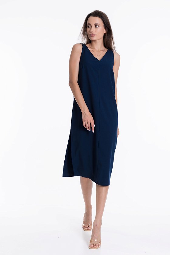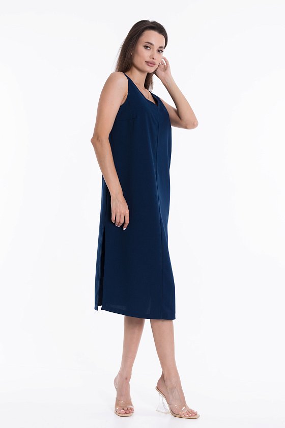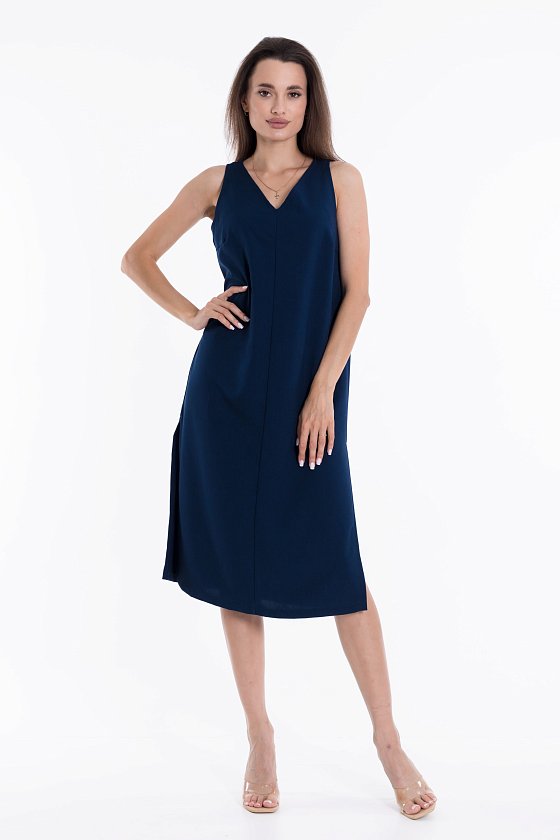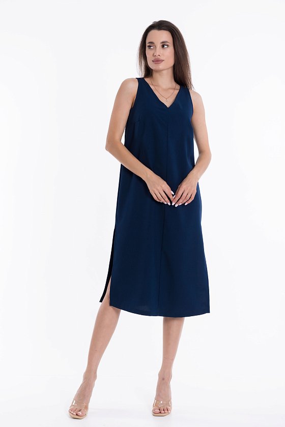 Платье из полотна "искусственный лен". Свободный силуэт, V-образный вырез горловины, средний шов по центру спинки и полочки делает платье особенно элегантным, в боковых швах разрезы.