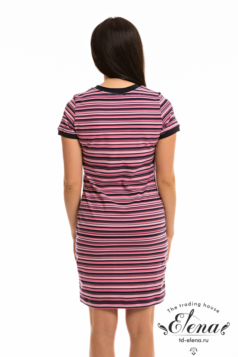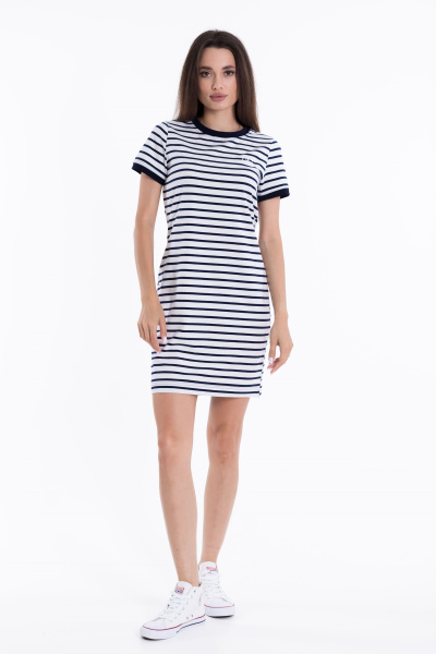 Летнее платье облегающего силуэта выполнено из х/б полотна с лайкрой. Круглый вырез горловины и низ рукавов оформлены планками. Спереди нанесена термопечать.