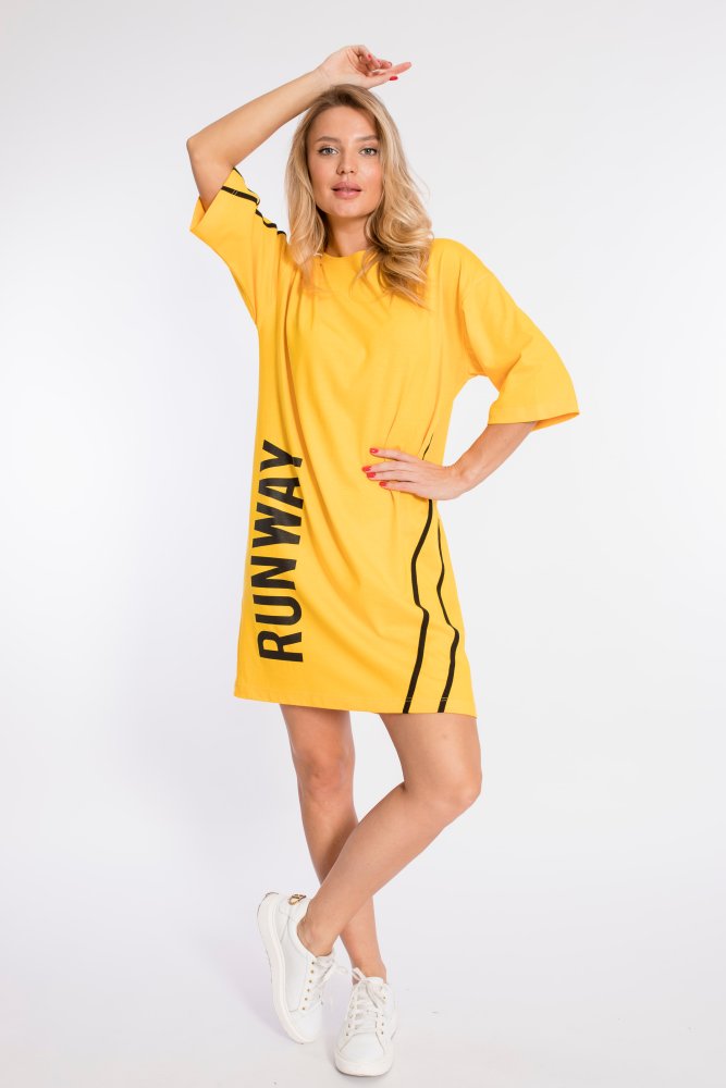 Платье спортивного стиля из футера с лайкрой. Основной цвет темный, второй цвет отделочный. Длинный рукав, широкий воротник-стойка, с застежкой на молнию. На рукаве расположена декоративная нашивка.