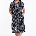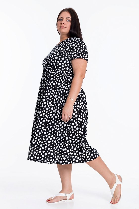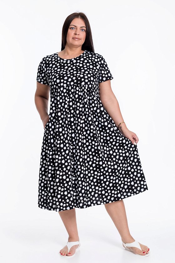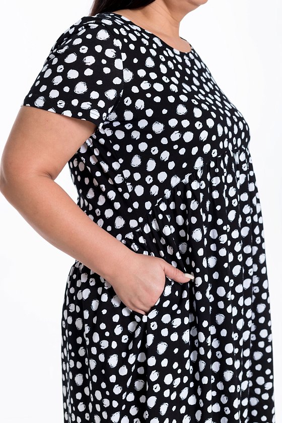 Платье из кулирки с коротким втачным рукавом и овальной горловиной. На полочке и спинке фигурная линия отреза юбки. Юбка со сборкой. В боковых швах карманы.