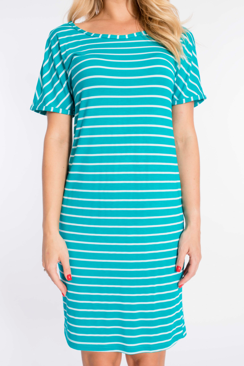 Платье выполнено из вискозы в полоску. Со спущенным рукавом и овальным вырезом горловины. Силуэт зауженный к низу.