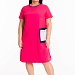 Платье с короткими рукавами выполнено из искусственного льна. По бокам декоративные разрезы, горловина оформлена бейкой контрастного цвета. Слева перед платья дополнен карманом.