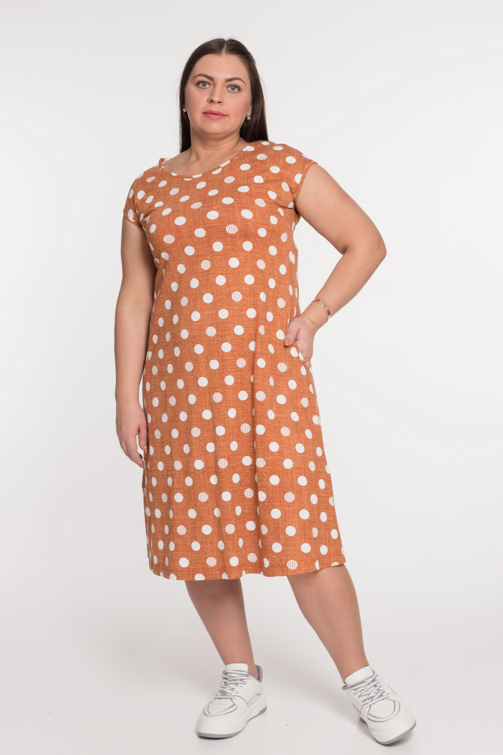 Платье из х/б полотна с набивным рисунком. Проймы, горловина и срезы карманов обработаны бейкой. По бокам размещены карманы, а внизу платья - разрезы.