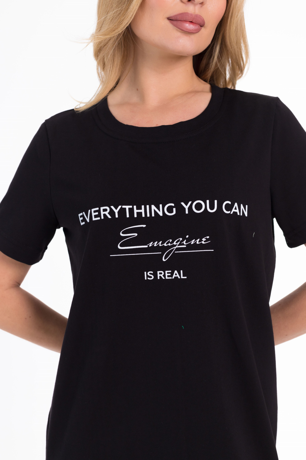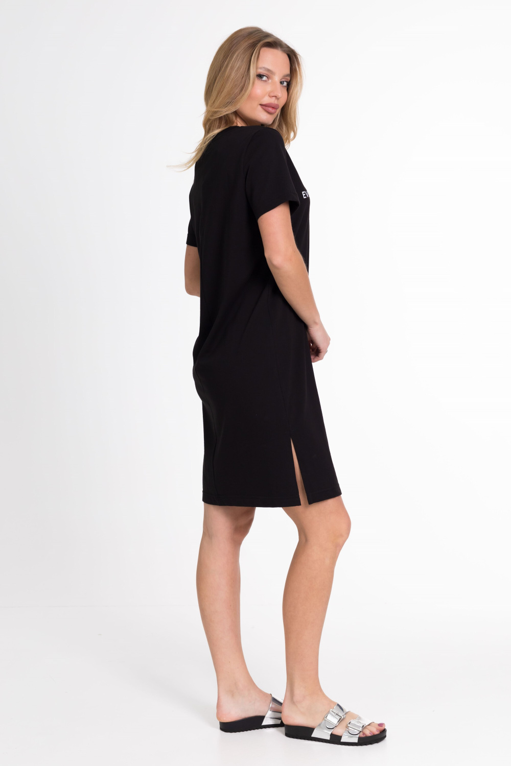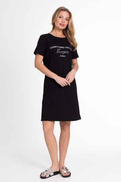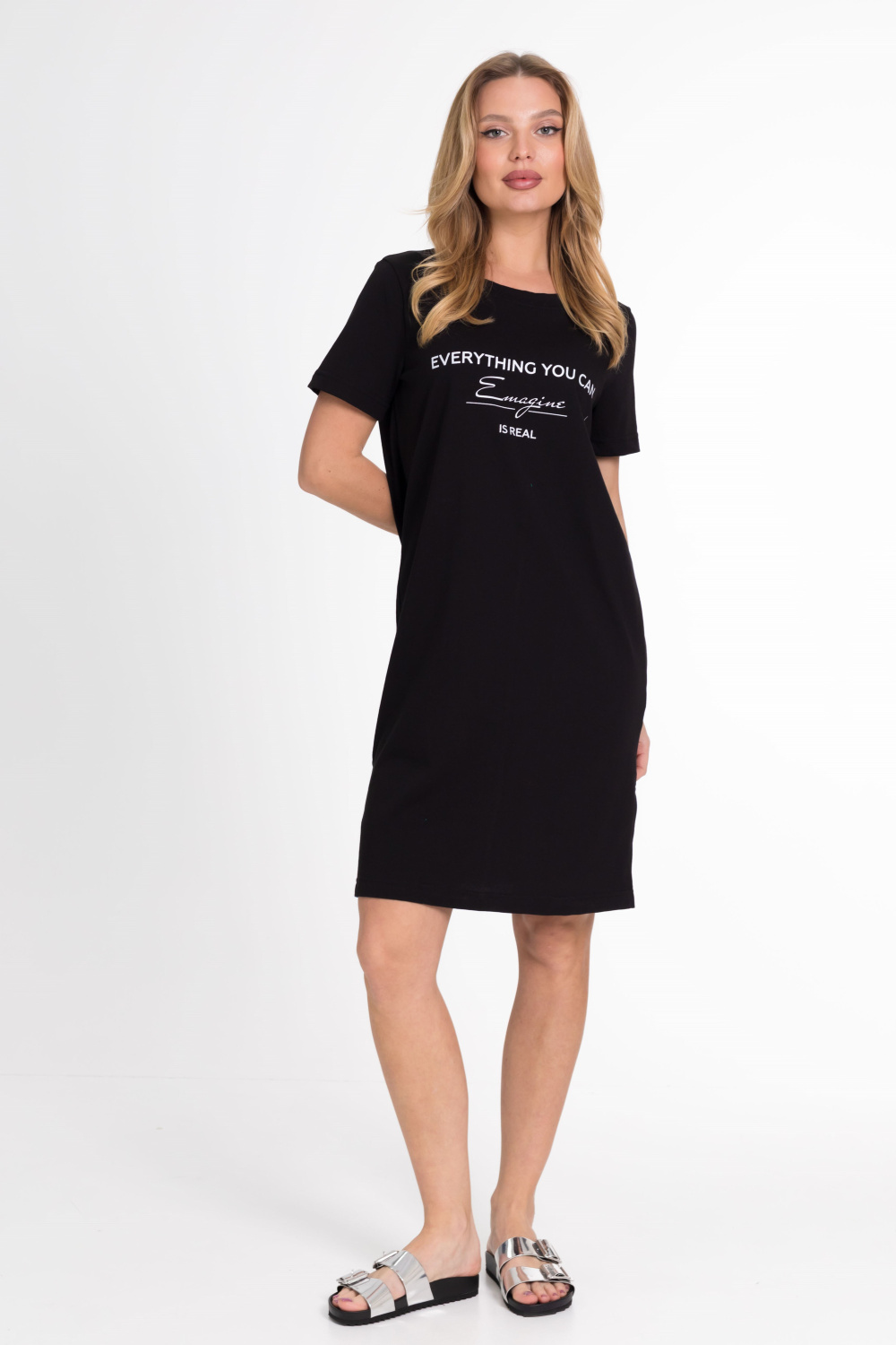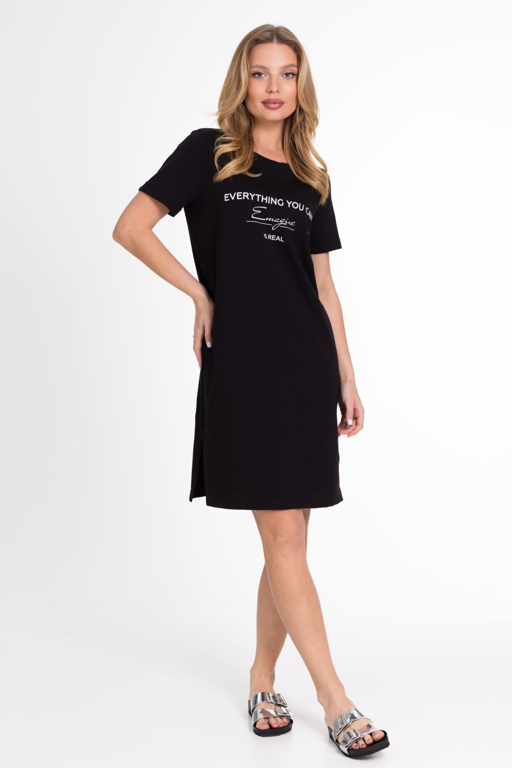 Платье из х/б полотна. В боковых швах внизу разрезы, на полочке принт, рукава короткие, горловина оформлена притачной планкой.