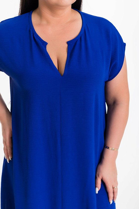 Платье выполнено из полотна "манго". Платье свободного силуэта, удлинённое, со спущенной линией плеча и декоративными разрезами по бокам снизу.
