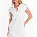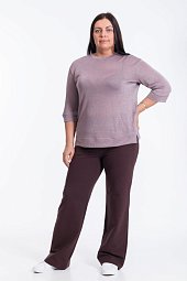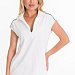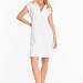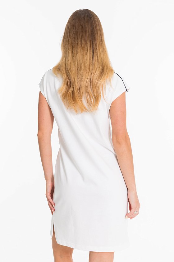 Платье выполнено из однотонной плотной кулирки. Платье с отложным воротником на отрезной стойке, со спущенной линией плеча и декором в виде канта. По низу боковых швов платья выполнены декоративные разрезы.