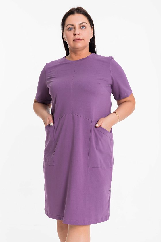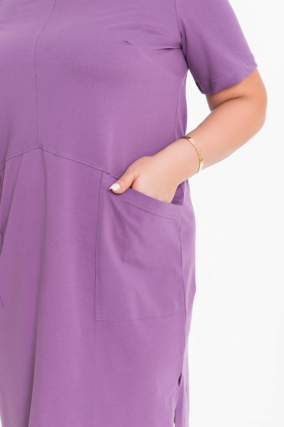 Женское платье выполнено из легкого хлопкового полотна лилового цвета. Круглый вырез горловины оформлен планкой. Спереди накладные карманы, по бокам, внизу декоративные разрезы. Уютный материал и стильный дизайн делают это платье практичным и привлекательным элементом одежды.