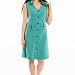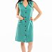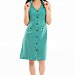 Платье выполнено из искусственного льна. Силуэт полуприлегающий. Застегивается на пуговицы, спереди расположены накладные карманы.