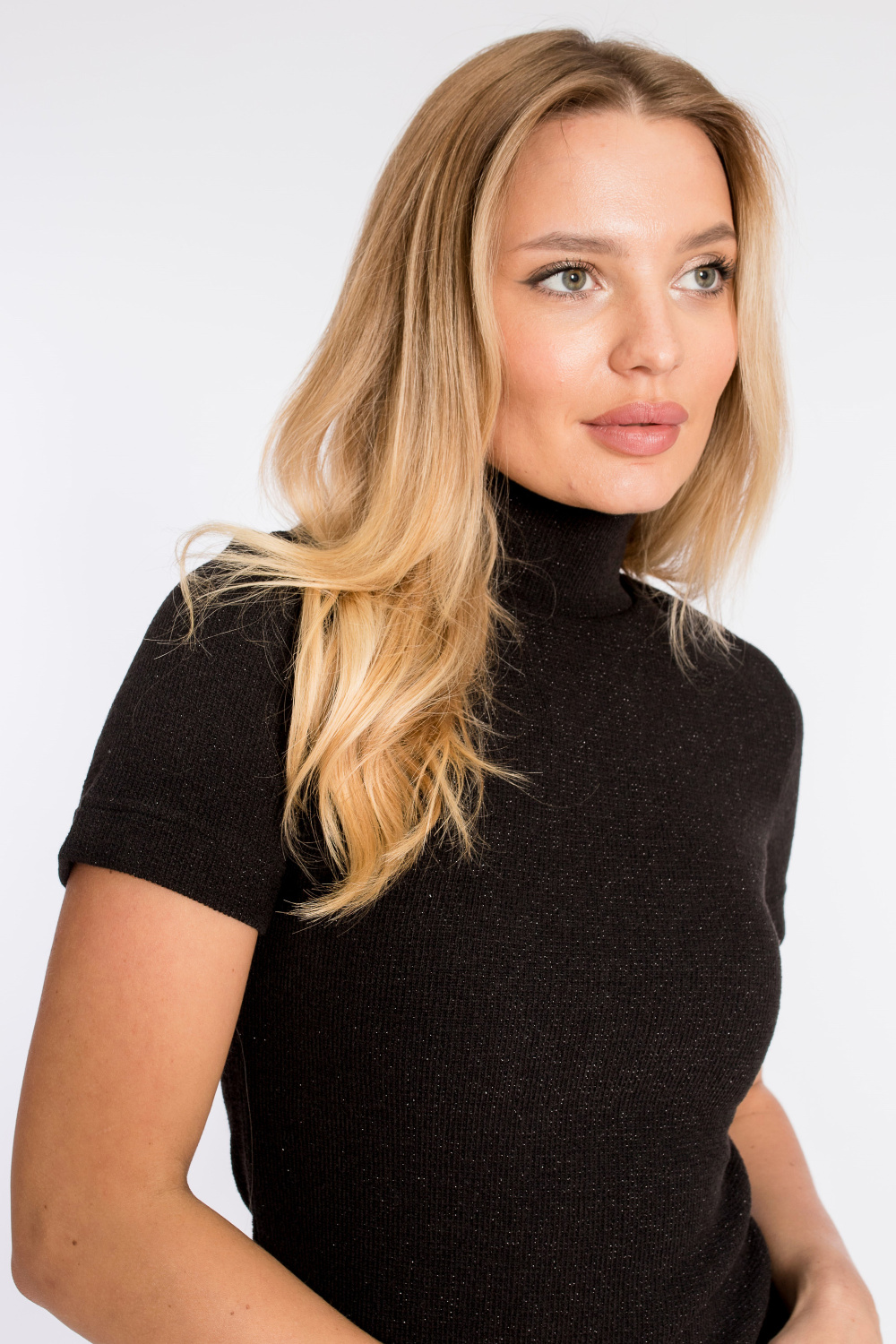 Платье с коротким рукавом выполнено из вязаного полотна с люрексом. Ластичное переплетение нитей обеспечивает комфортное ношение. Воротник-стойка, на левом рукаве расположен декоративный элемент.