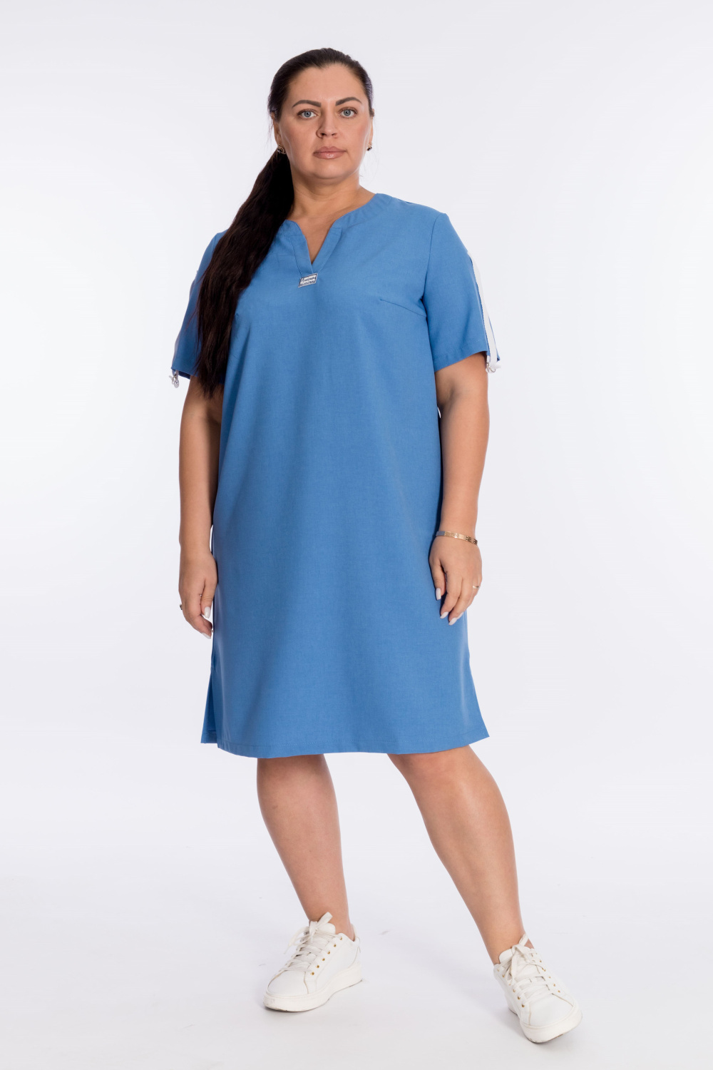 Платье прямого силуэта выполнено из однотонного искусственного льна. С втачным рукавом до локтя. Длина рукавов регулируется киперной лентой с полукольцами. Горловина обработана планками. Внизу расходящихся планок - нашивка. Внизу, по боковым швам платья разрезы.