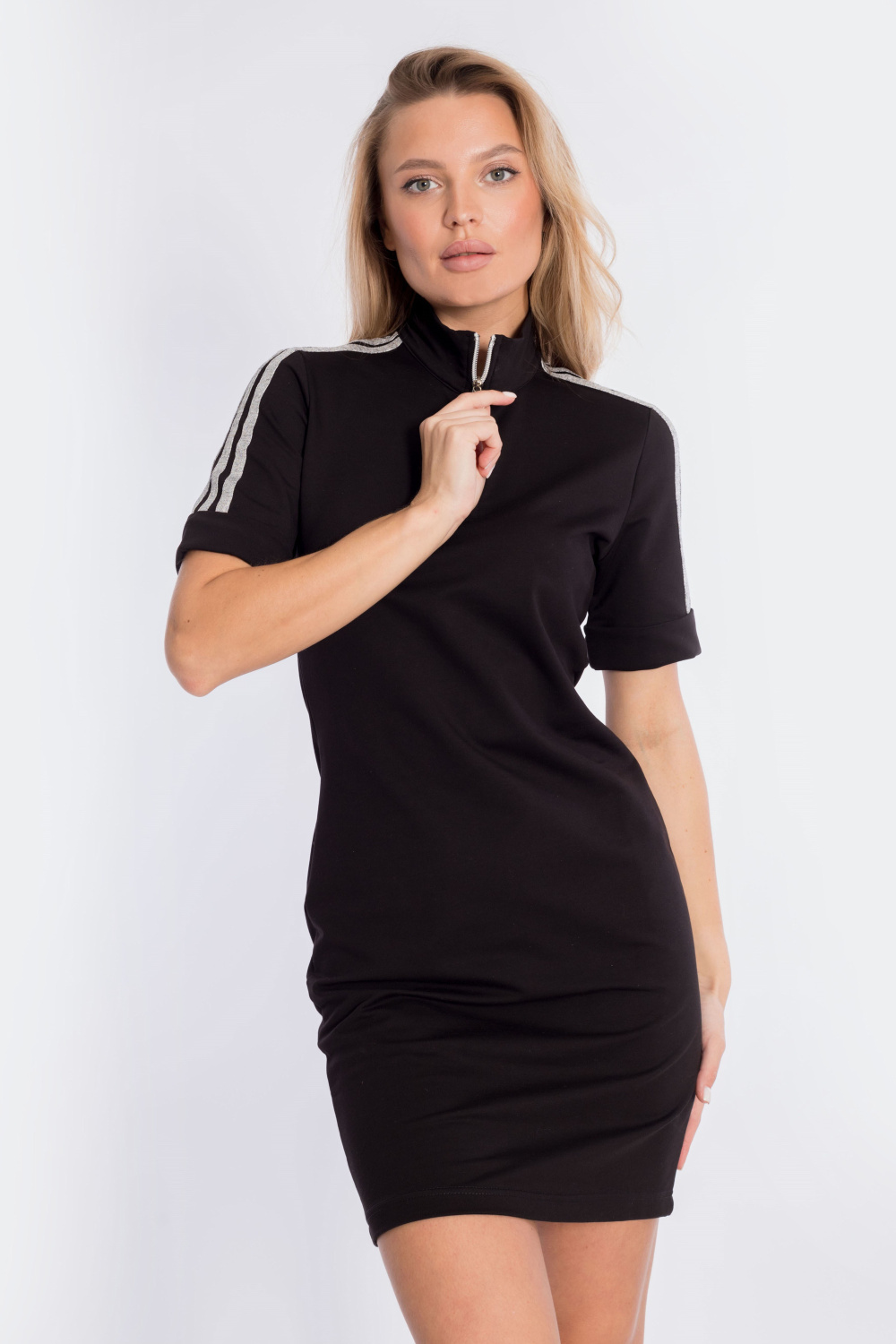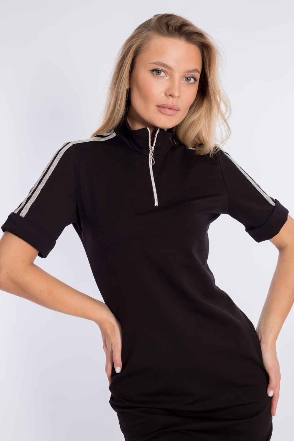 Платье выполнено из футер петли с лайкрой. Горловина с короткой застёжкой на молнию, на рукавах настрочены лампасы. Сзади нанесён принт.