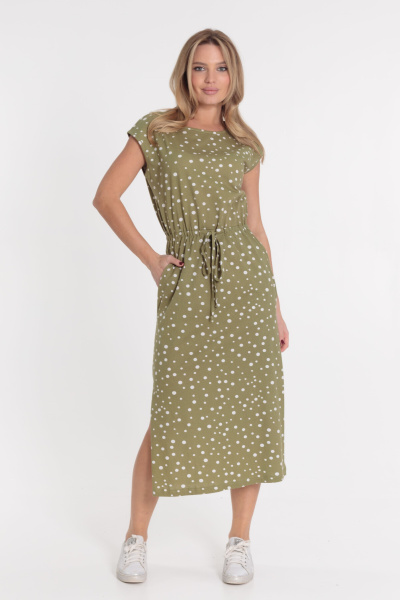 Платье со спущенной линией плеча выполнено из кулирки. Отрезное по линии талии, с кулиской, в которую продёрнут шнур. По бокам размещены карманы. По низу боковых швов разрезы.