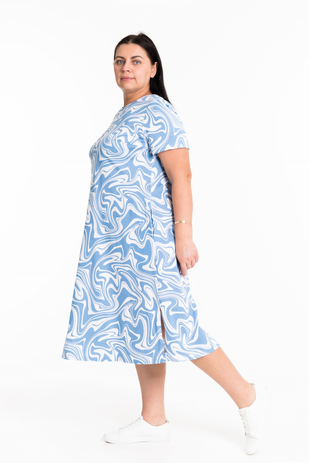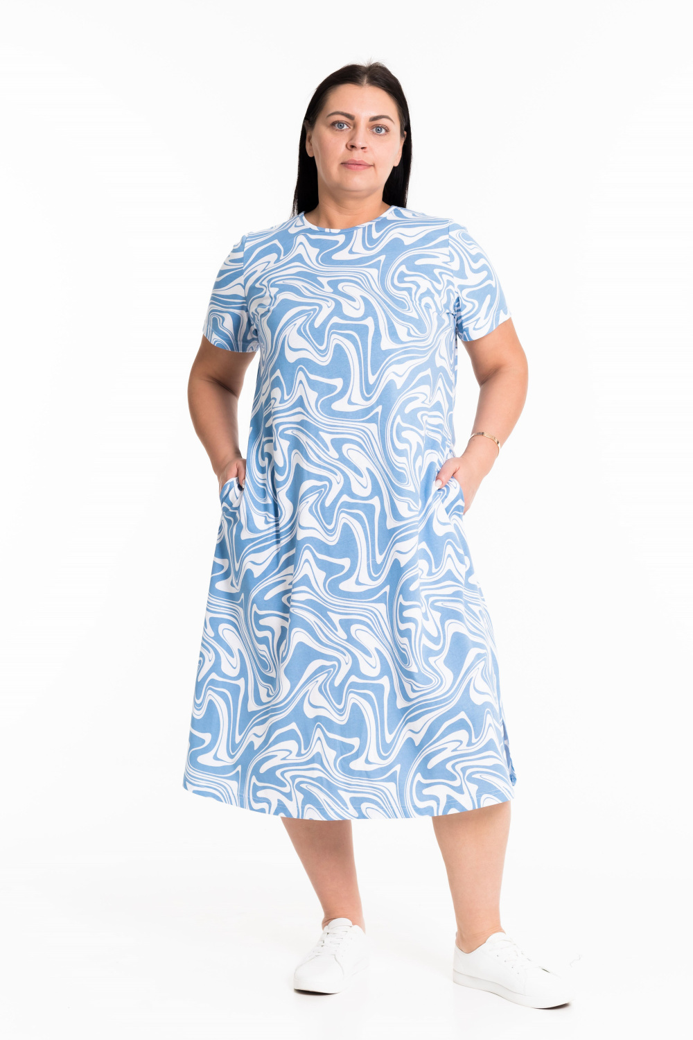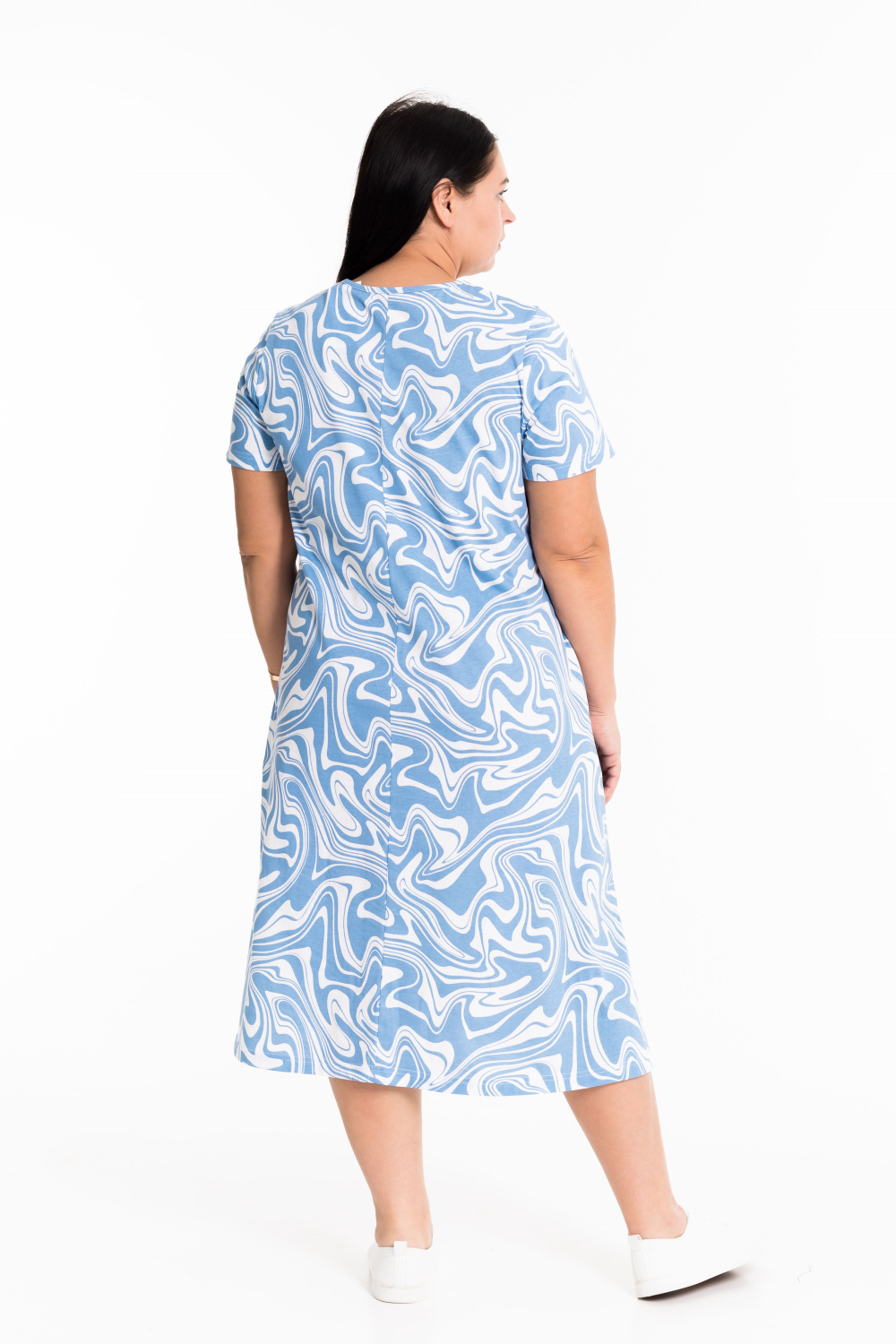 Женское платье свободного силуэта выполнено из х/б полотна. По бокам декоративные разрезы, горловина оформлена бейкой. В боковых швах размещены карманы.