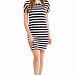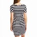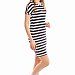 Платье выполнено из вискозы в полоску. Со спущенным рукавом и овальным вырезом горловины. Силуэт зауженный к низу.