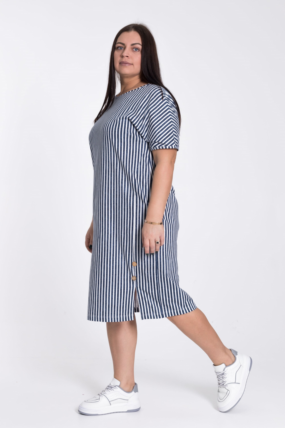 Платье из х/б полотна в вертикальную полоску, что зрительно делает силуэт фигуры стройным.