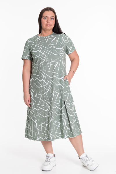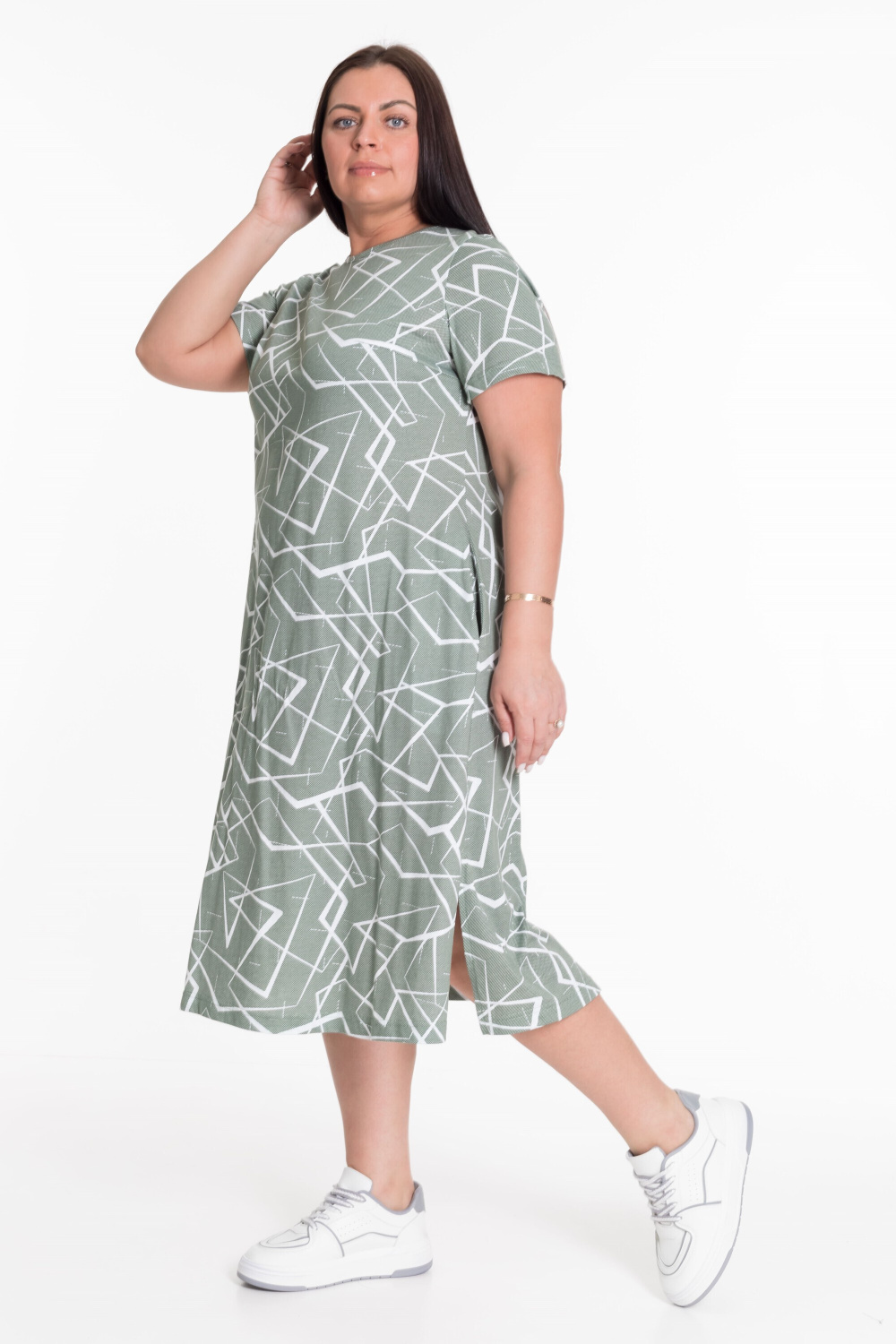 Платье из х/б полотна. По бокам разрезы, карманы в боковых швах, горловина обработана бейкой из основного полотна.