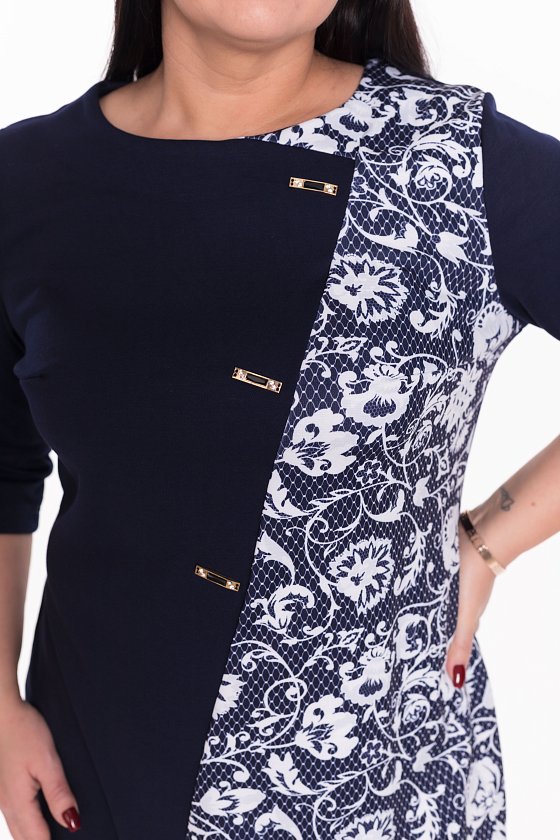 Платье женское выполнено из полотна академик, силуэт облегающий. Горловина имеет круглый вырез, рукава длиной 3/4. Спереди разрезная полочка со вставкой из отделочного полотна, в качестве декора пришиты пряжки, по низу изделия разрез.