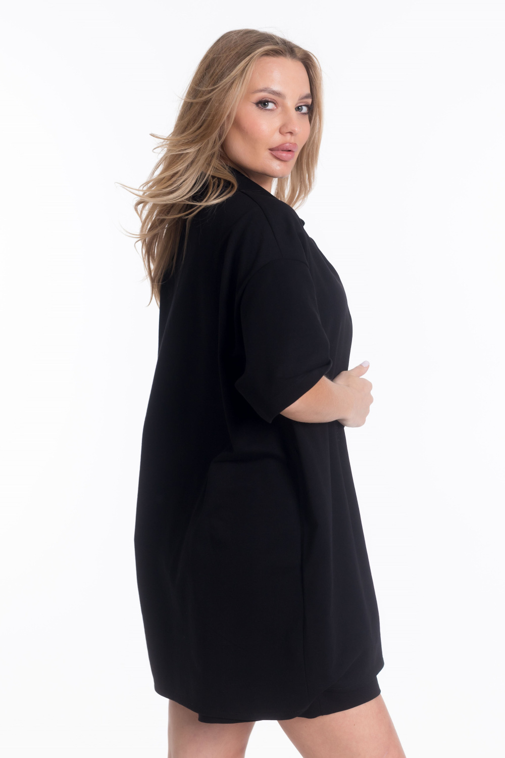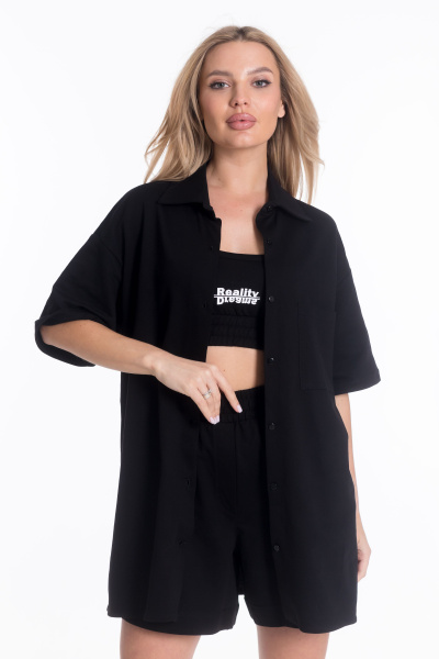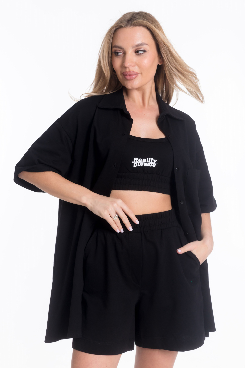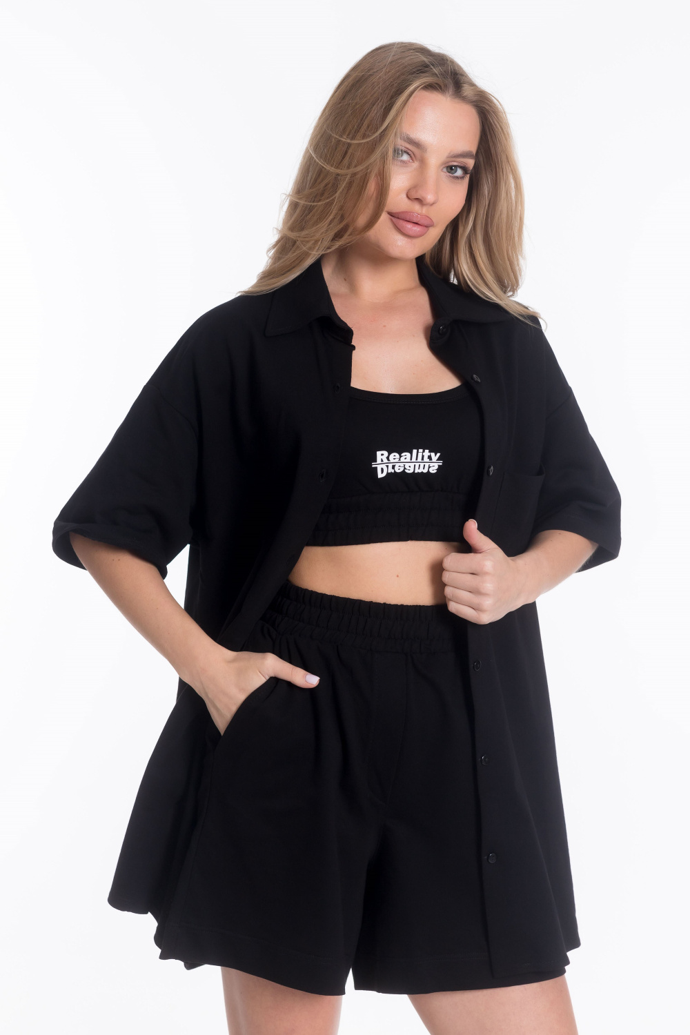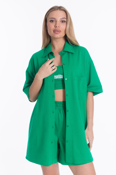Рубашка из футера 2х нитки. Спущенная линия плеча, длина рукава до локтя, застежка на пуговицах, воротник на стойке, спереди карман.