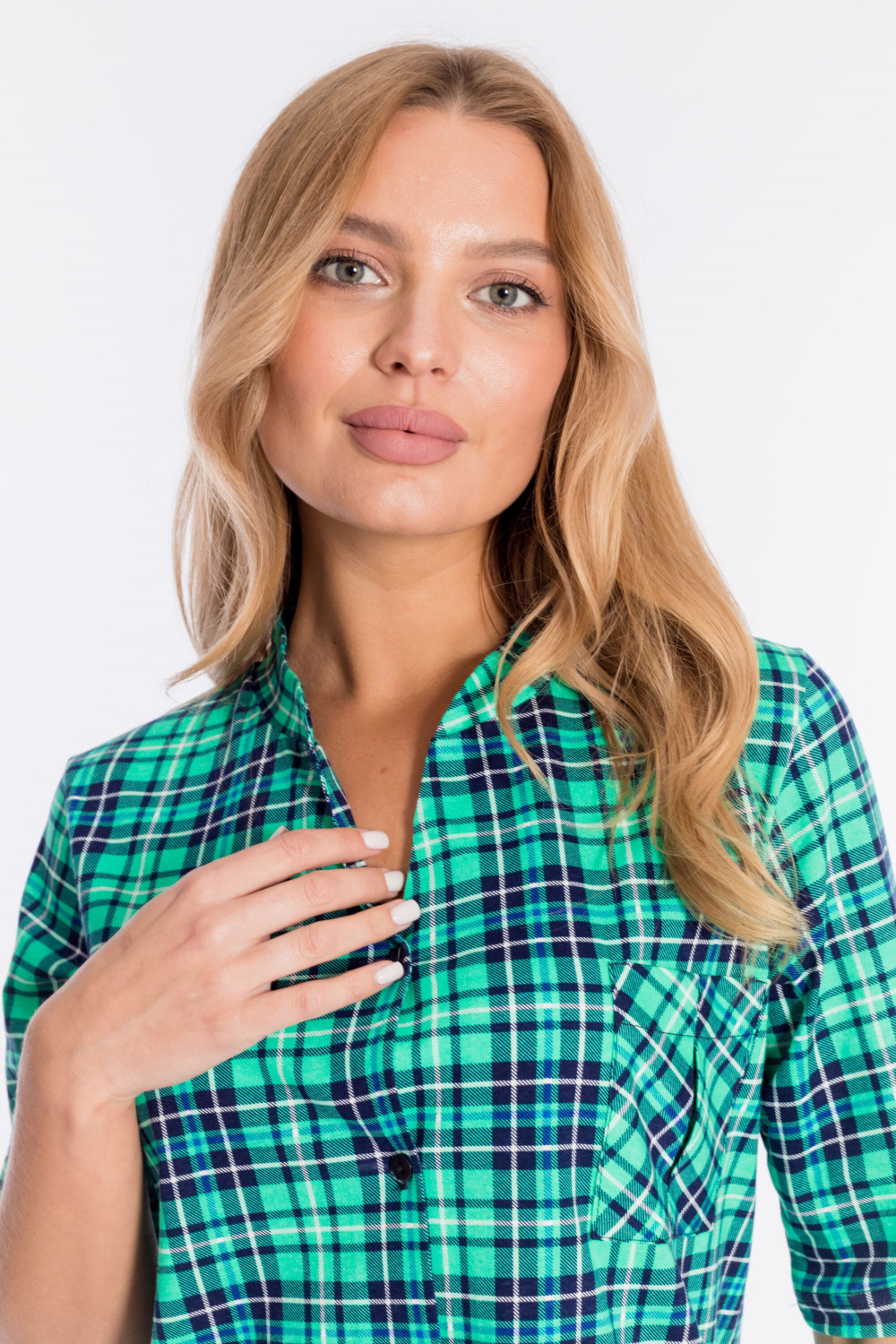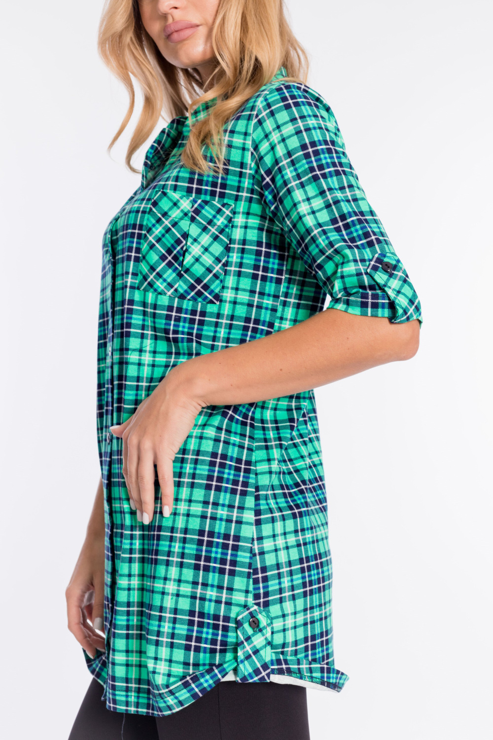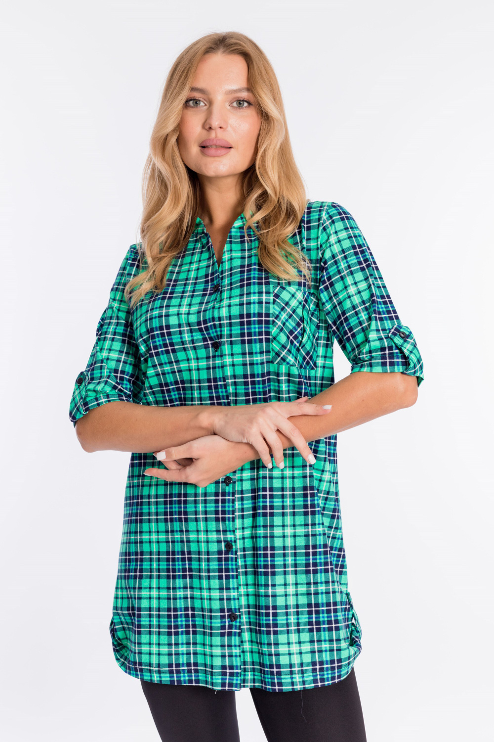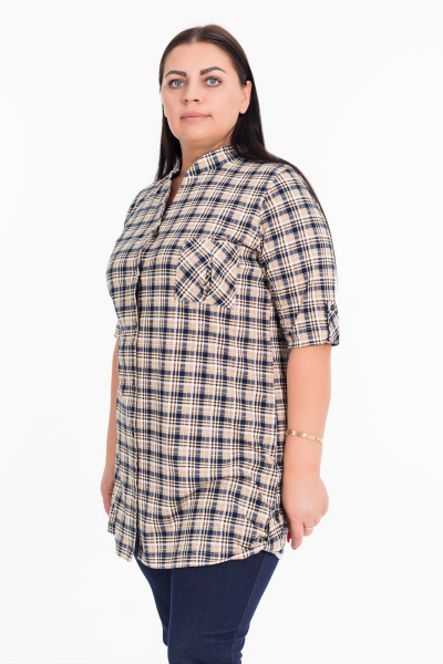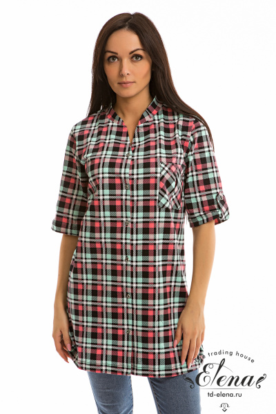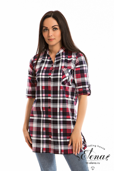 Рубашка с рукавом длиной 3/4 и центральной застёжкой на пуговицы. Воротник-стойка, спереди расположен накладной карман, на рукавах и снизу по бокам отделка паты.