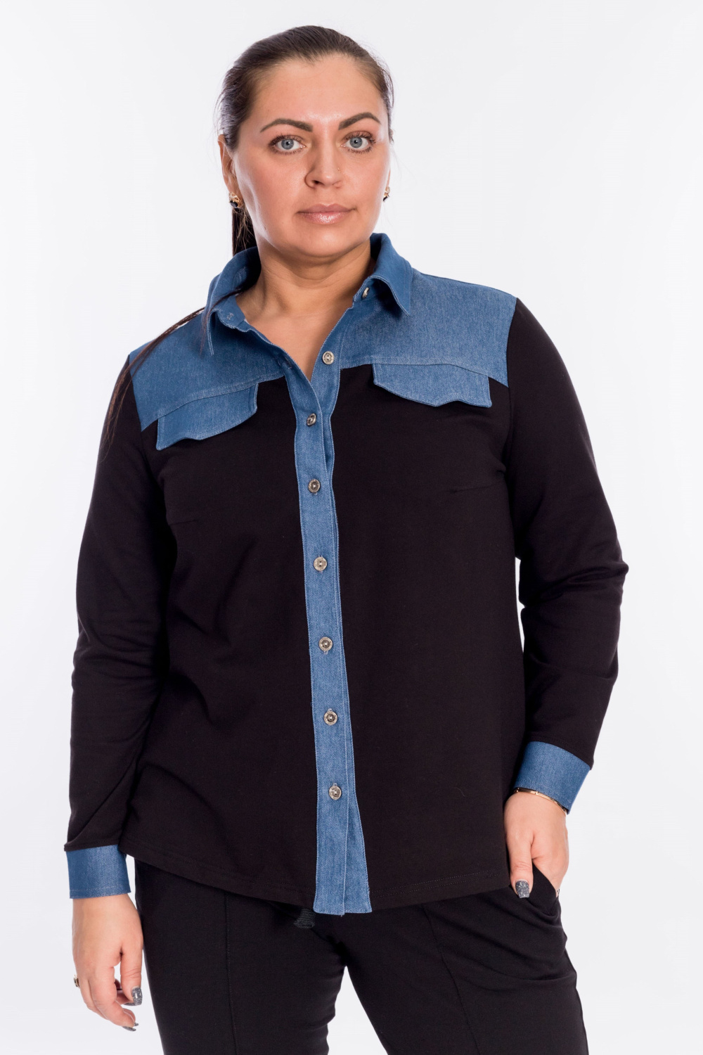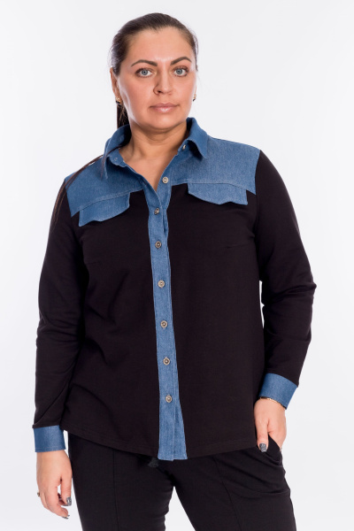 Рубашка выполнена из футера с лайкрой и деталями из джинсового материала. Спереди и на спинке кокетки. Сзади под кокеткой петелька, а спереди клапаны. Воротник на отрезной стойке. Спереди застёжка на пуговицы на притачной планке. Рукав с манжетой на пуговице.