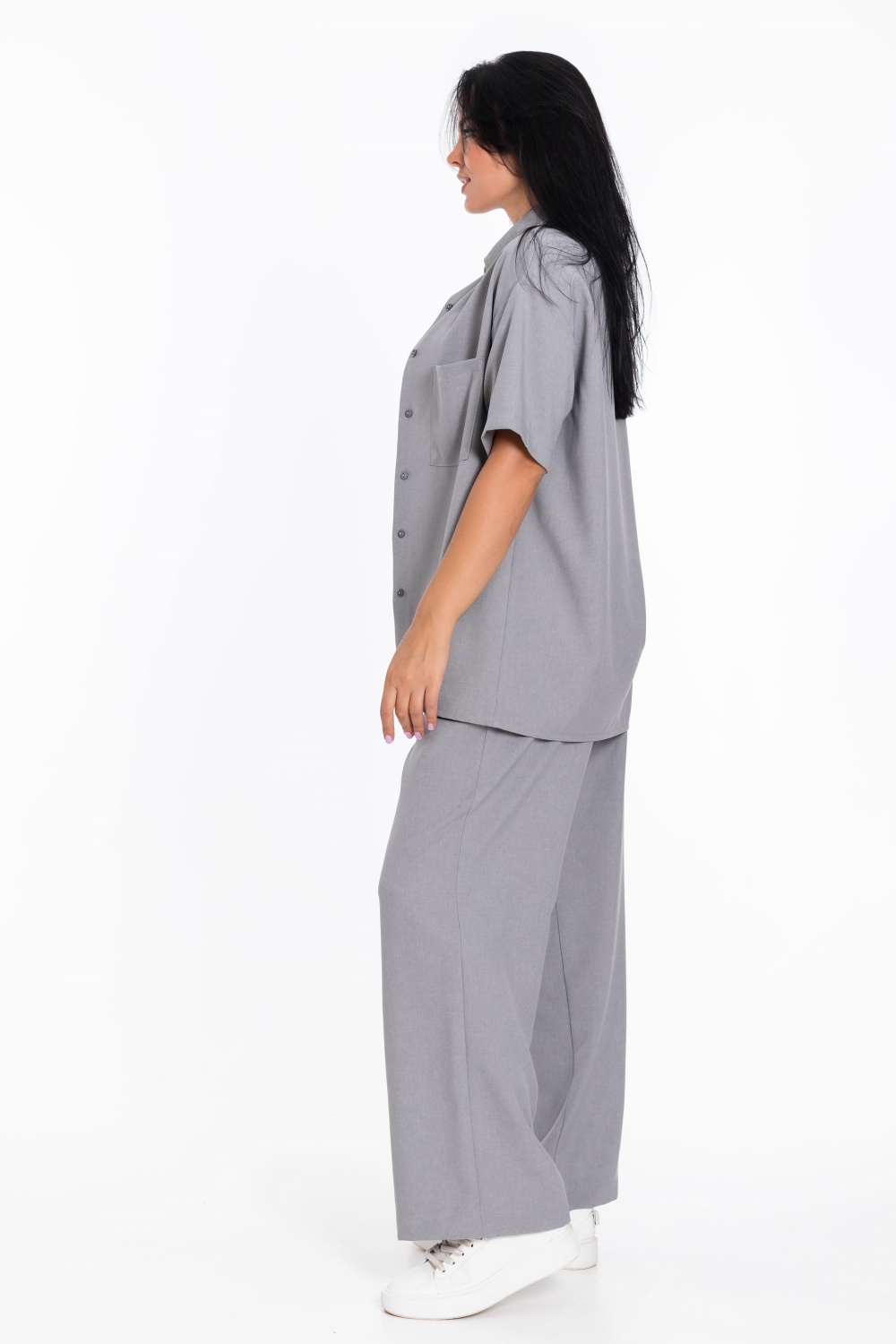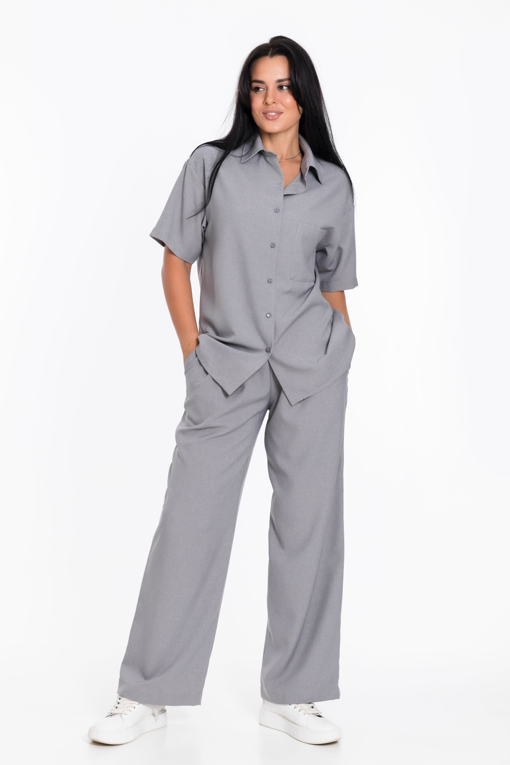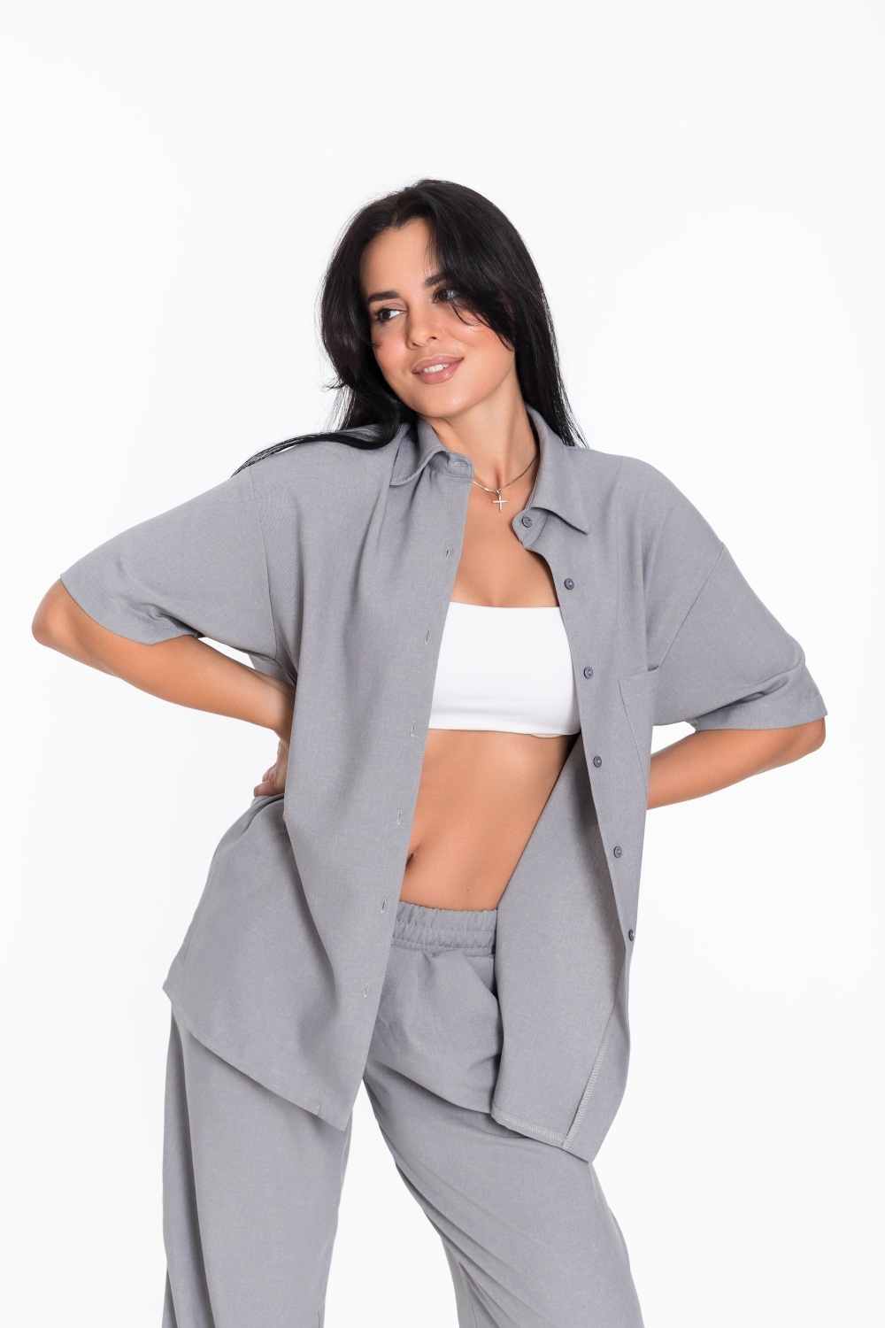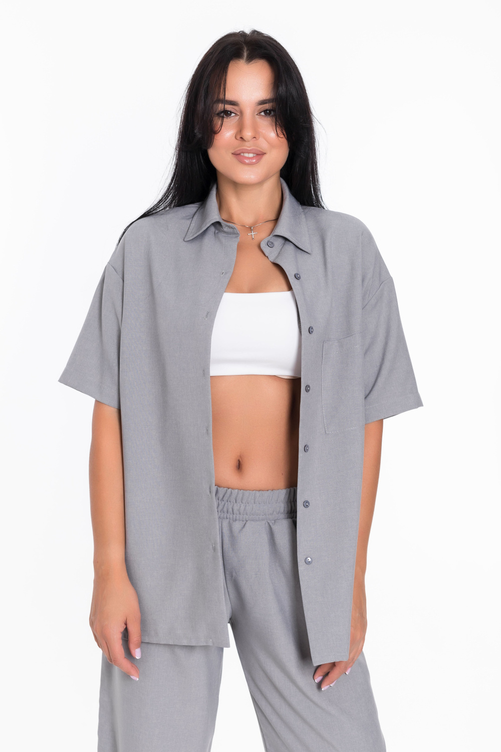 Женская рубашка серого цвета со спущенной линией плеча и длиной рукава до локтя — отличный выбор для создания элегантного образа. Модель застёгивается на пуговицы спереди, имеет воротник на стойке и карман на левой стороне. Однотонный дизайн добавляет рубашке универсальности и позволяет сочетать её с различными элементами гардероба.