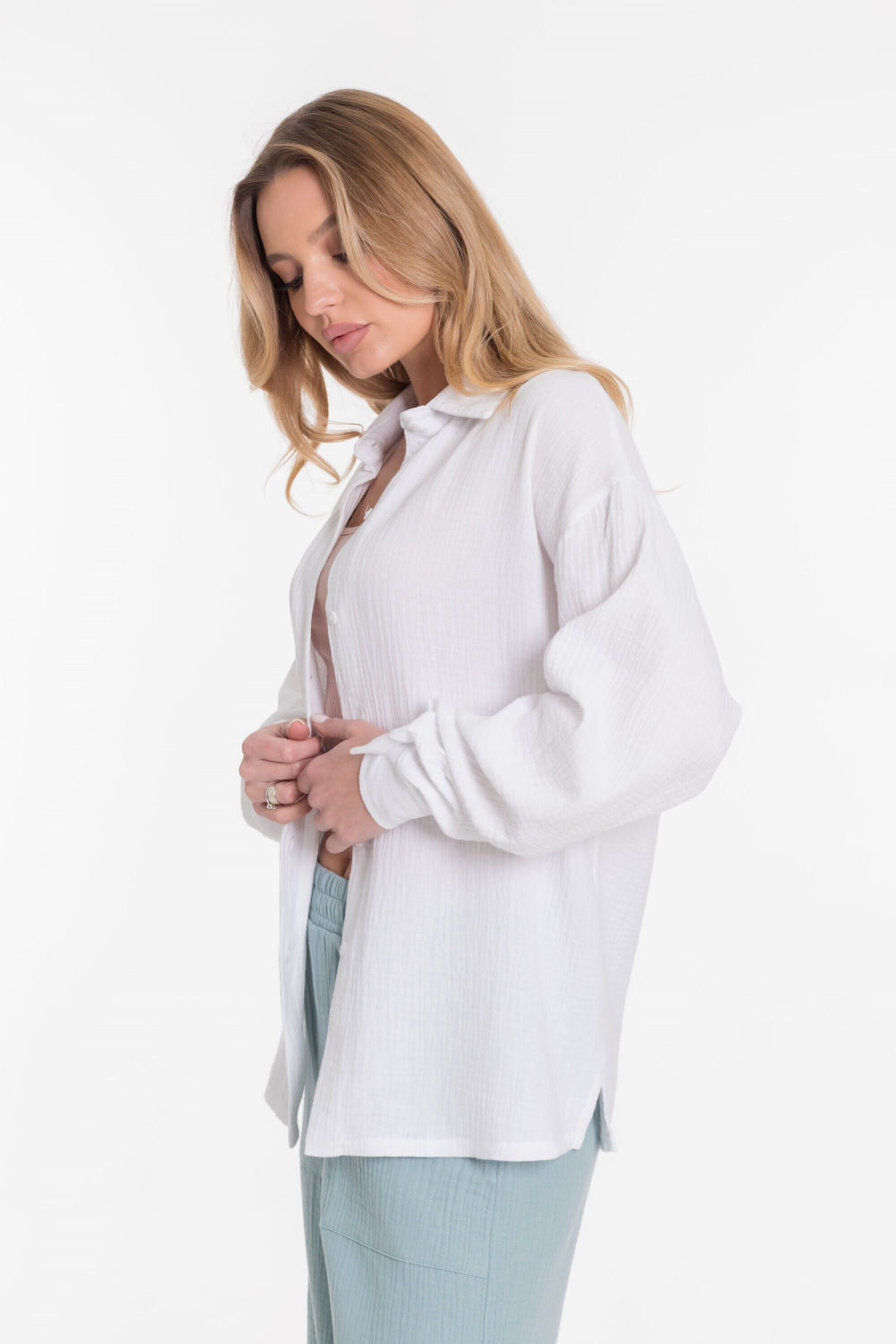 Женская рубашка — отличный выбор для повседневной носки. Она изготовлена из мягкого, лёгкого натурального материала — муслина. Рубашка имеет длинный спущенный рукав и застёжку на пуговицы. Воротник на отрезной стойке придаёт модели элегантность. В боковых швах есть небольшие разрезы, которые добавляют изюминку в дизайн. Такая однотонная рубашка идеально подойдёт для прогулок, отдыха или неформальных мероприятий. Она выполнена из качественного материала, который хорошо пропускает воздух и обеспечивает хорошую вентиляцию.