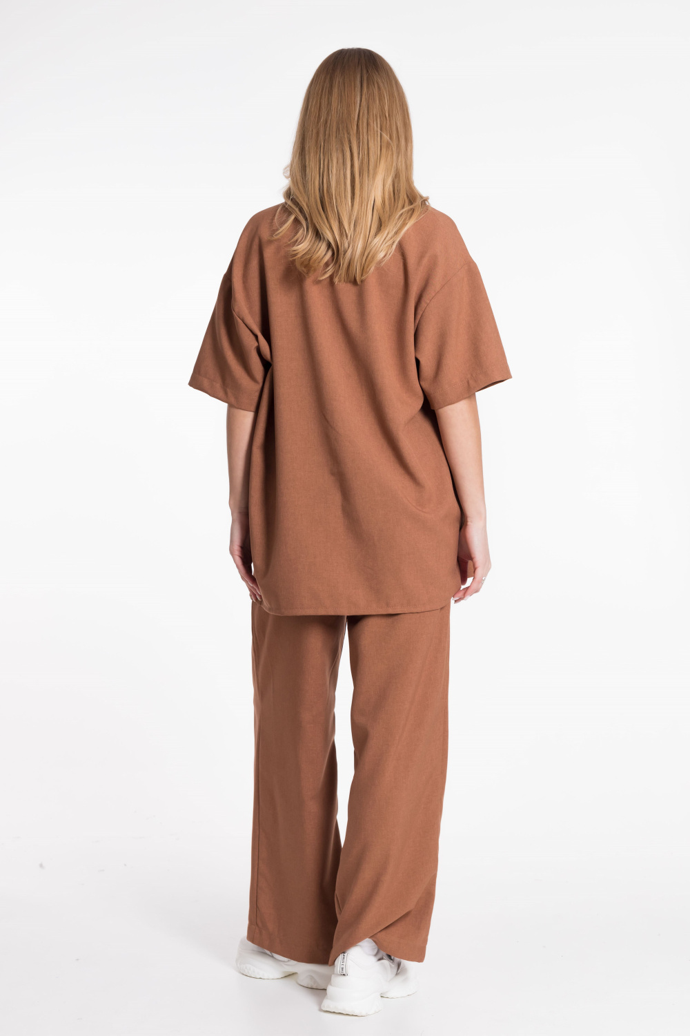 Женская рубашка коричневого цвета со спущенной линией плеча и длиной рукава до локтя — отличный выбор для создания элегантного образа. Модель застёгивается на пуговицы спереди, имеет воротник на стойке и карман на левой стороне. Однотонный дизайн добавляет рубашке универсальности и позволяет сочетать её с различными элементами гардероба.