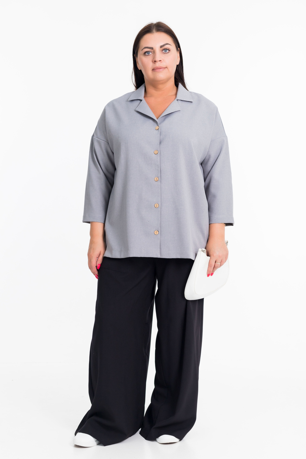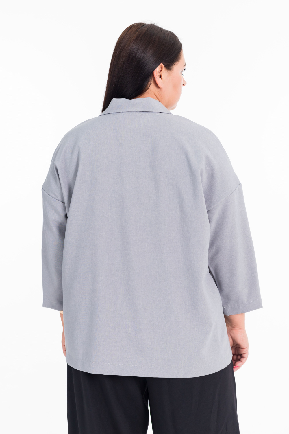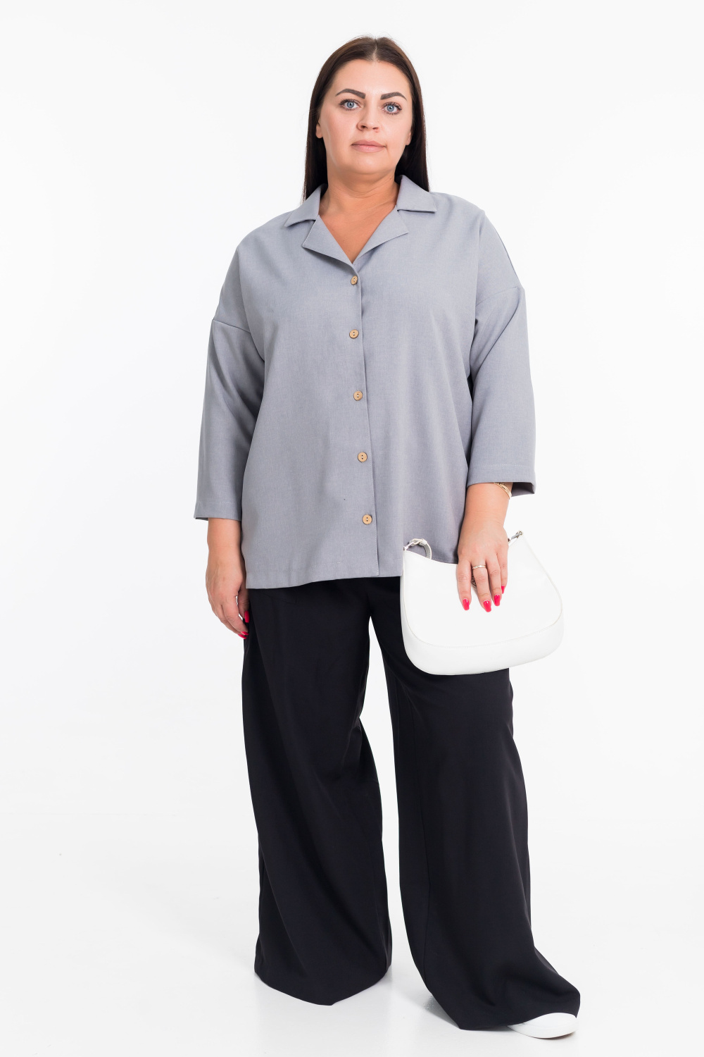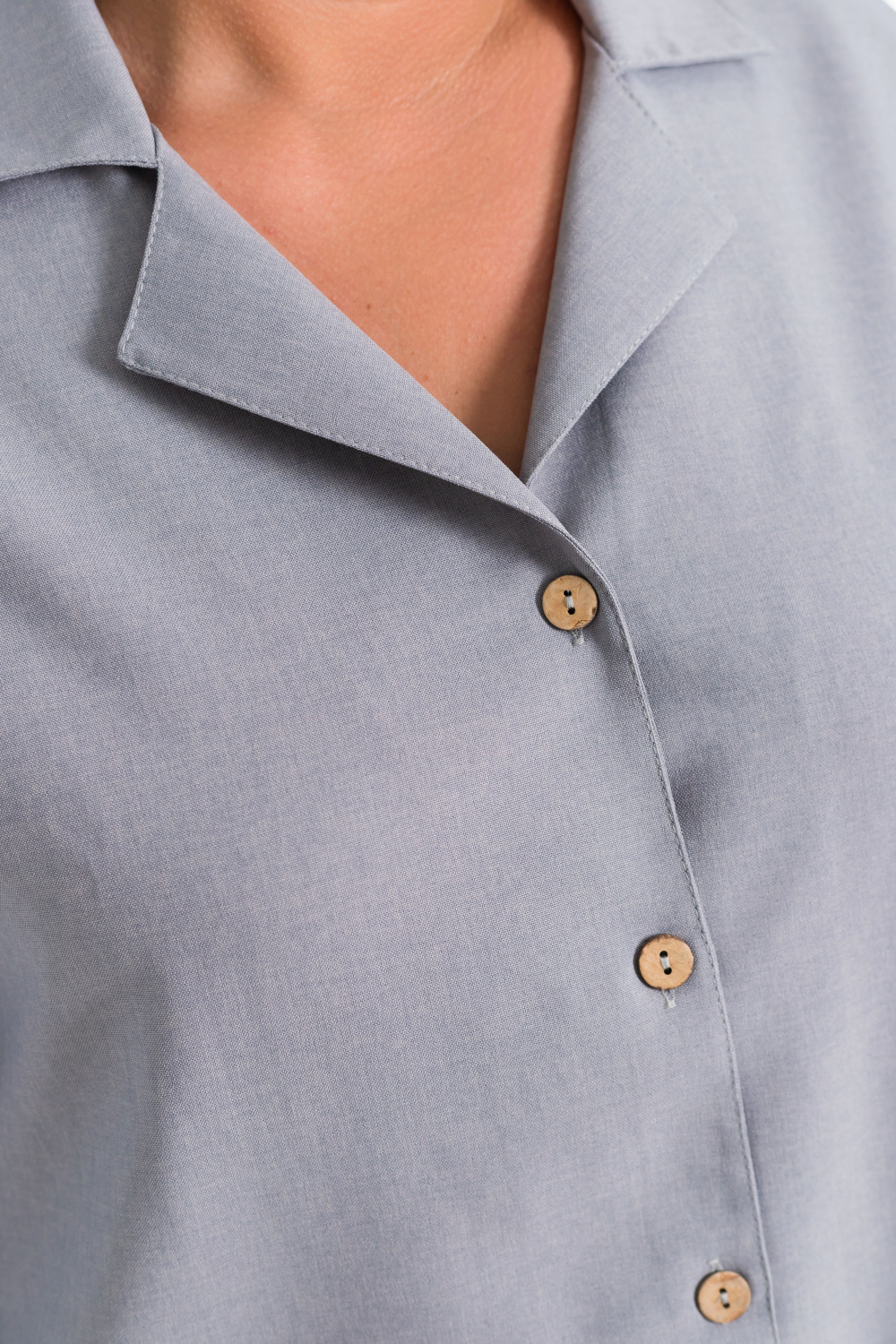 Женская рубашка серого цвета со спущенной линией плеча  — отличный выбор для создания элегантного образа. Модель застёгивается на пуговицы спереди, имеет отложной воротник. Однотонный дизайн добавляет рубашке универсальности и позволяет сочетать её с различными элементами гардероба.