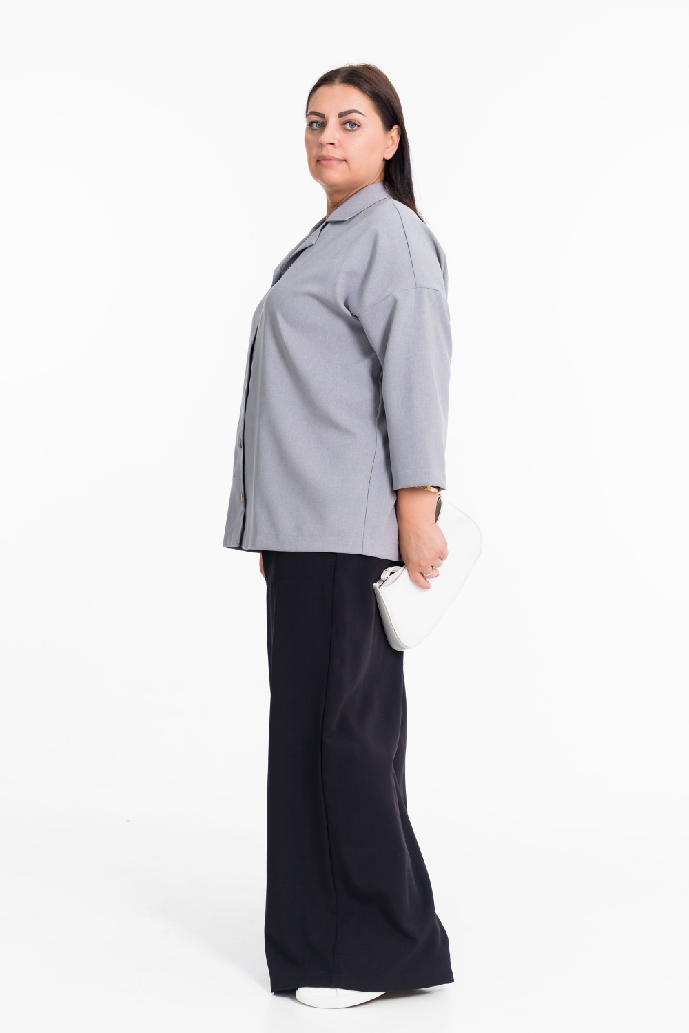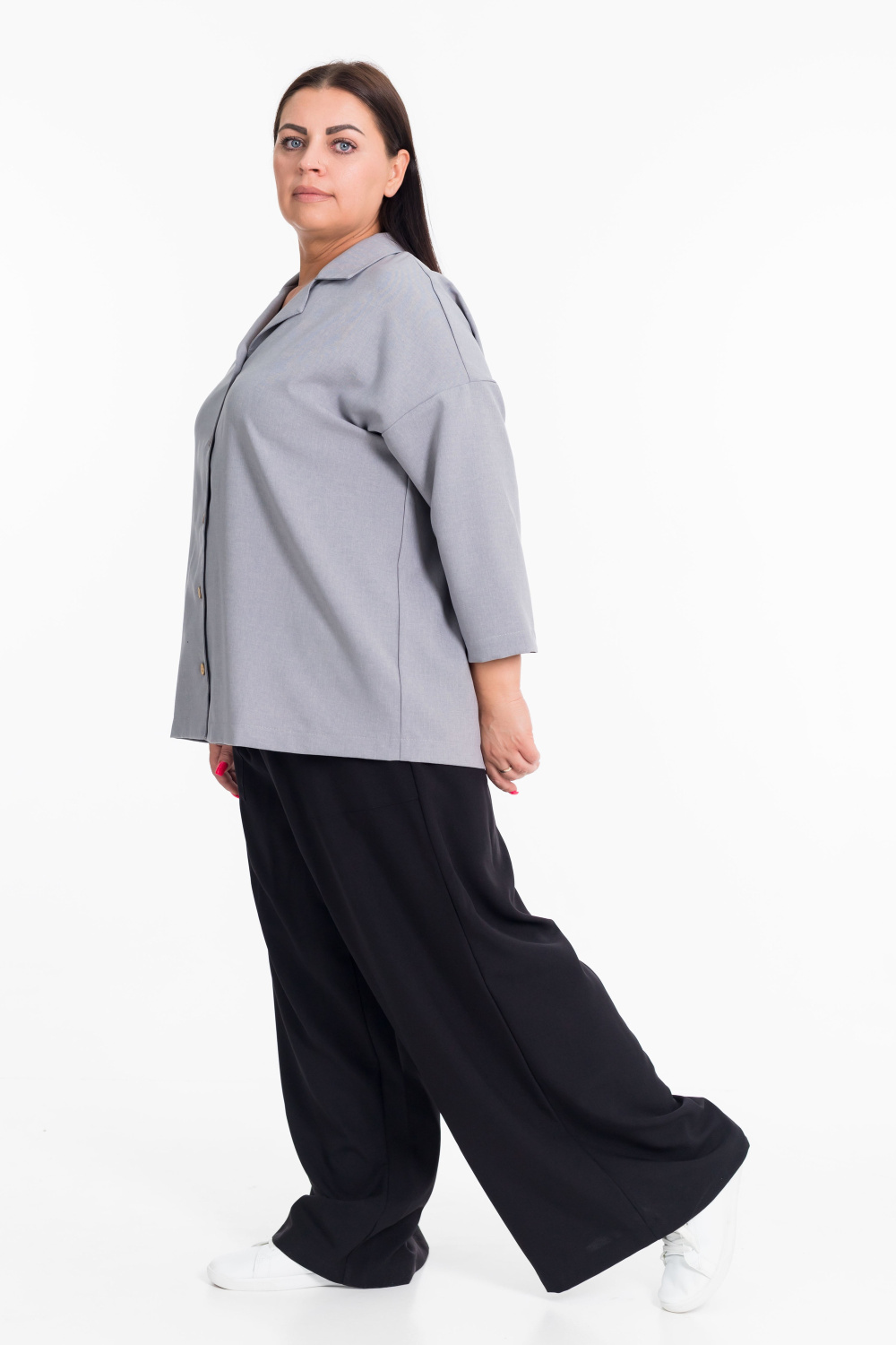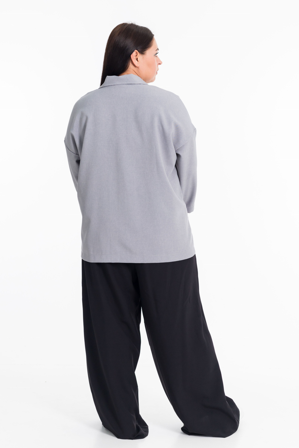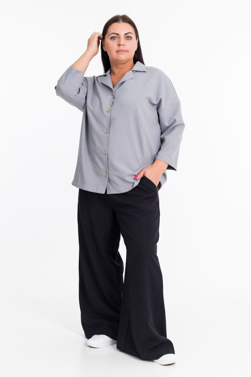 Женская рубашка серого цвета со спущенной линией плеча  — отличный выбор для создания элегантного образа. Модель застёгивается на пуговицы спереди, имеет отложной воротник. Однотонный дизайн добавляет рубашке универсальности и позволяет сочетать её с различными элементами гардероба.