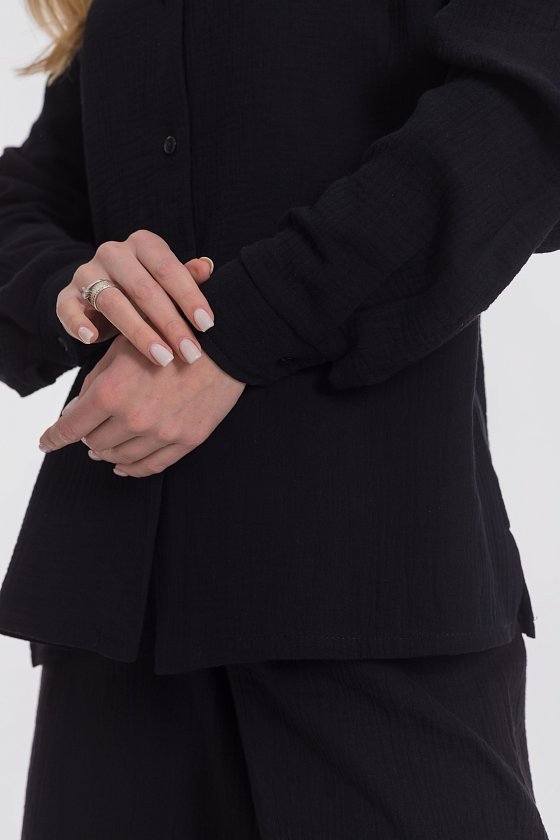 Женская рубашка — отличный выбор для повседневной носки. Она изготовлена из мягкого, лёгкого натурального материала — муслина. Рубашка имеет длинный спущенный рукав и застёжку на пуговицы. Воротник на отрезной стойке придаёт модели элегантность. В боковых швах есть небольшие разрезы, которые добавляют изюминку в дизайн. Такая однотонная рубашка идеально подойдёт для прогулок, отдыха или неформальных мероприятий. Она выполнена из качественного материала, который хорошо пропускает воздух и обеспечивает хорошую вентиляцию.