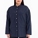 Женская рубашка свободного силуэта из однотонного искусственного льна синего цвета. С центральной застежкой на пуговицы, воротником стойкой и длинным рукавом рубашечного покроя. Рукав прямой без манжеты для легкого отворота. Спереди декоративные длинные накладные карманы.