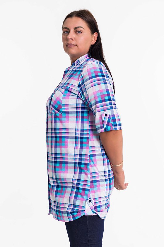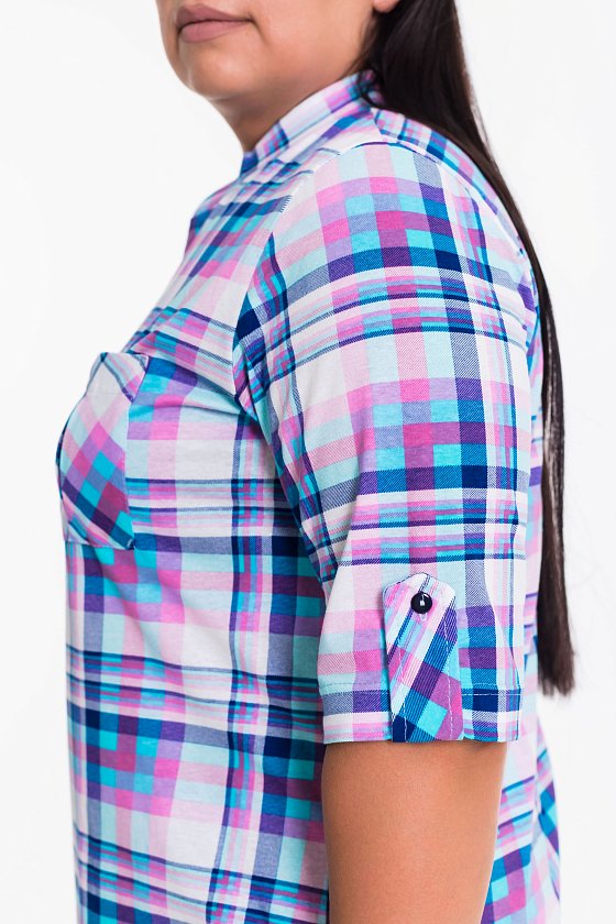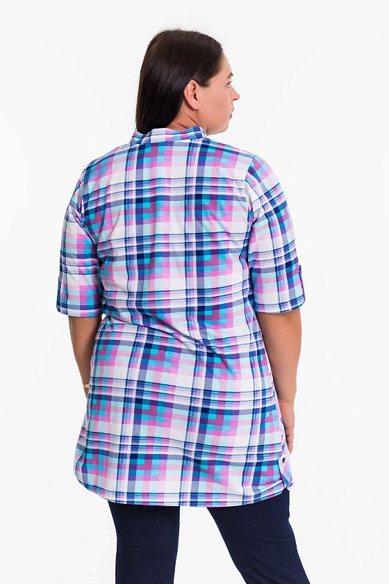Рубашка с рукавом длиной 3/4 и центральной застёжкой на пуговицы. Воротник-стойка, спереди накладной карман, на рукавах и снизу по бокам отделка паты.