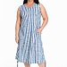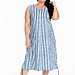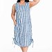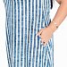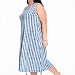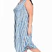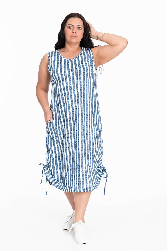 Платье выполнено из х/б полотна в вертикальную полоску. В боковых швах размещены карманы. Горловина и проймы обработаны бейкой. Внизу, по бокам расположены кулисы со шнурами.