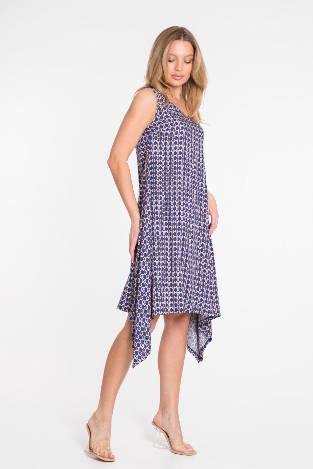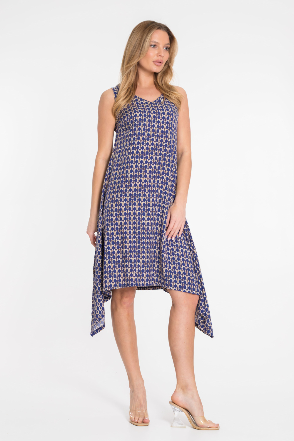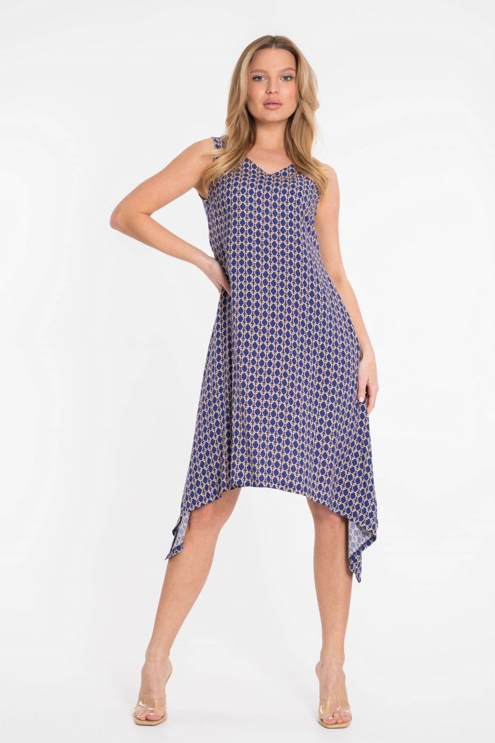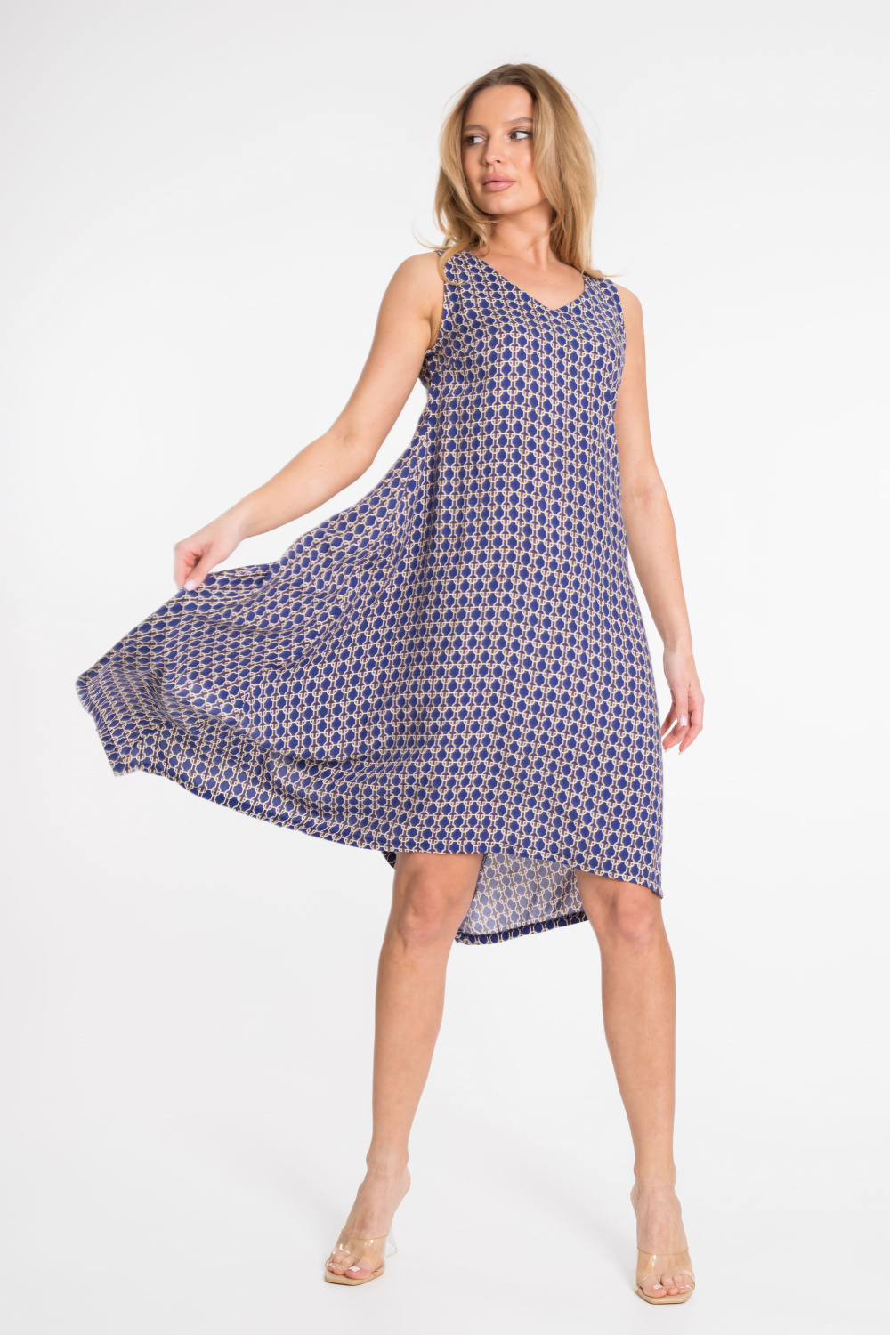 Платье из штапеля с набивным рисунком. Вырез горловины V-образный, низ платья разноуровневый - боковые стороны длиннее.