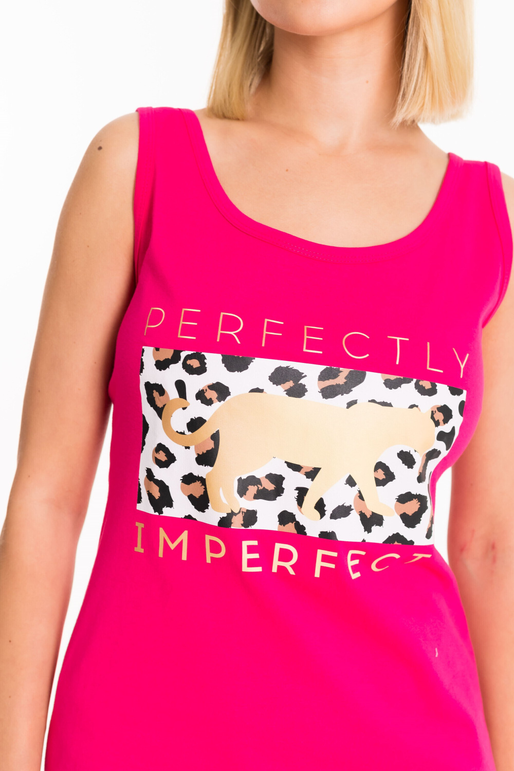 Сарафан выполнен из однотонного трикотажного полотна. Круглый вырез горловины и проймы изделия обработаны бейкой. Спереди расположен принт. Длина до колена, по бокам разрезы.