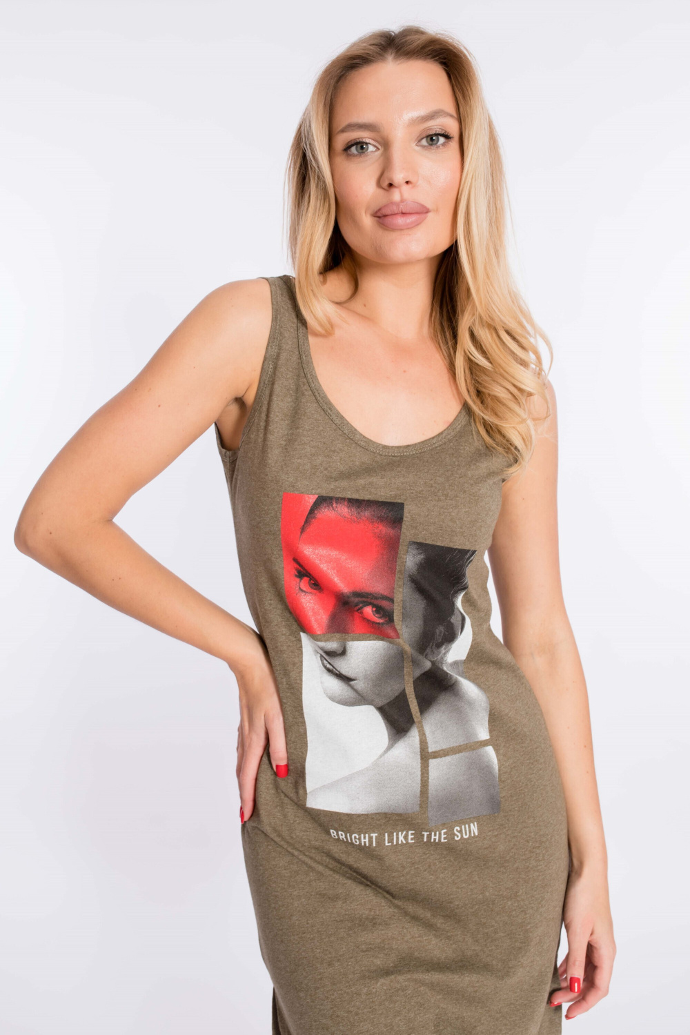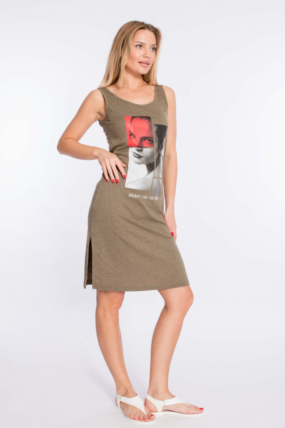 Сарафан выполнен из однотонного трикотажного полотна. Круглый вырез горловины и проймы изделия обработаны бейкой. Спереди расположен принт. Длина до колена, по бокам разрезы.