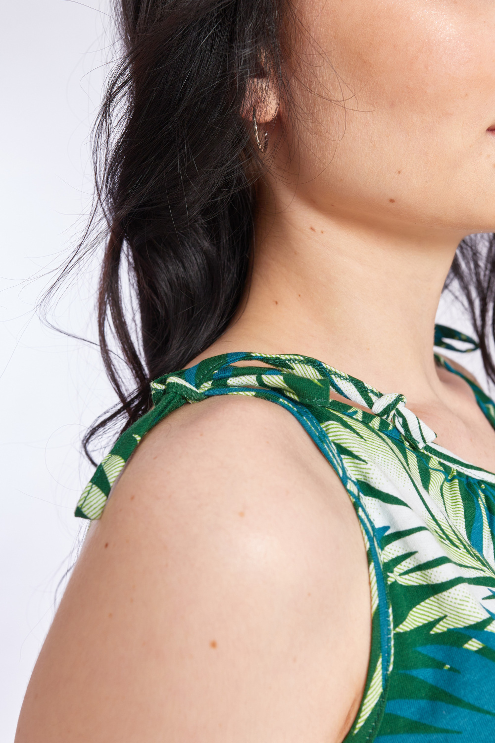 Сарафан на бретельках выполнен из х/б полотна с набивным рисунком. На резинке по талии и с карманами по бокам.