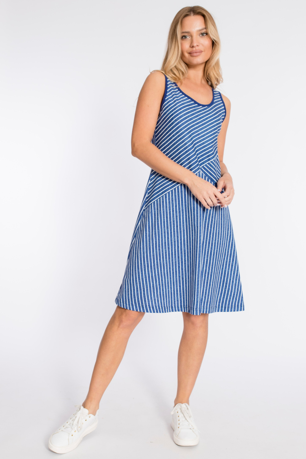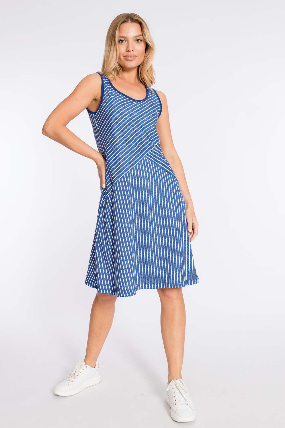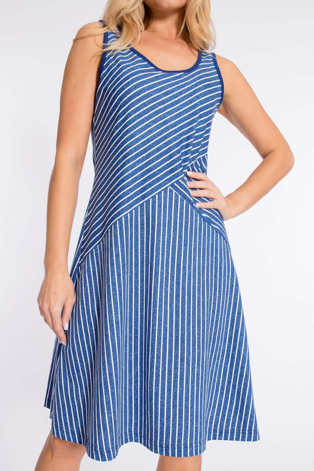 Сарафан выполнен из кулирки в вертикальную полоску. Детали сшиты с разным направлением полос, что делает модель сарафана интересной. Горловина и проймы обработаны однотонной бейкой. Внизу силуэт сарафана расклешён.