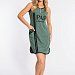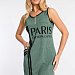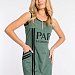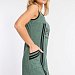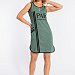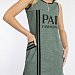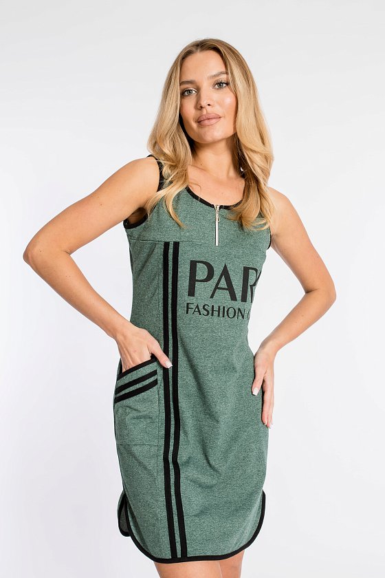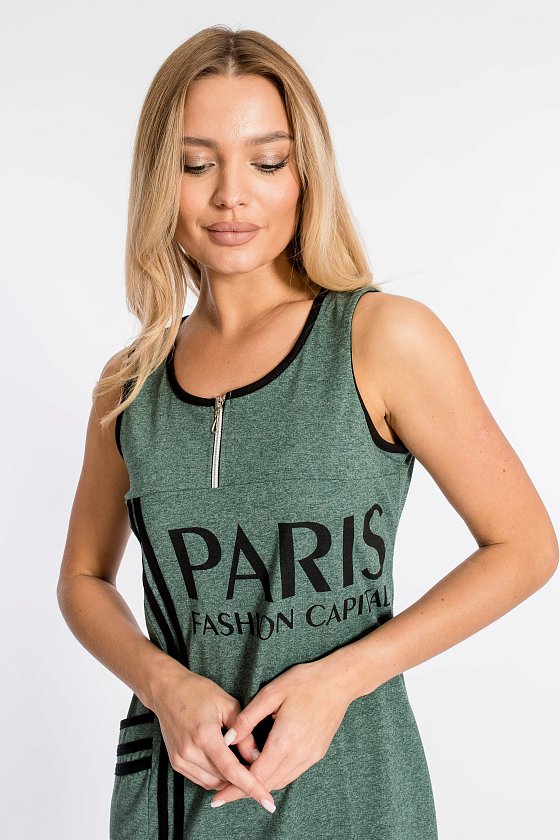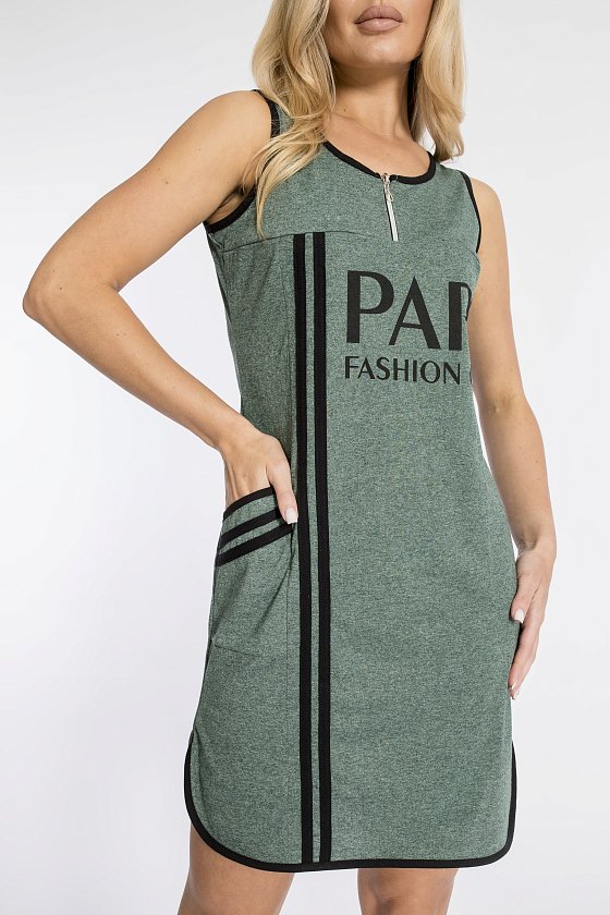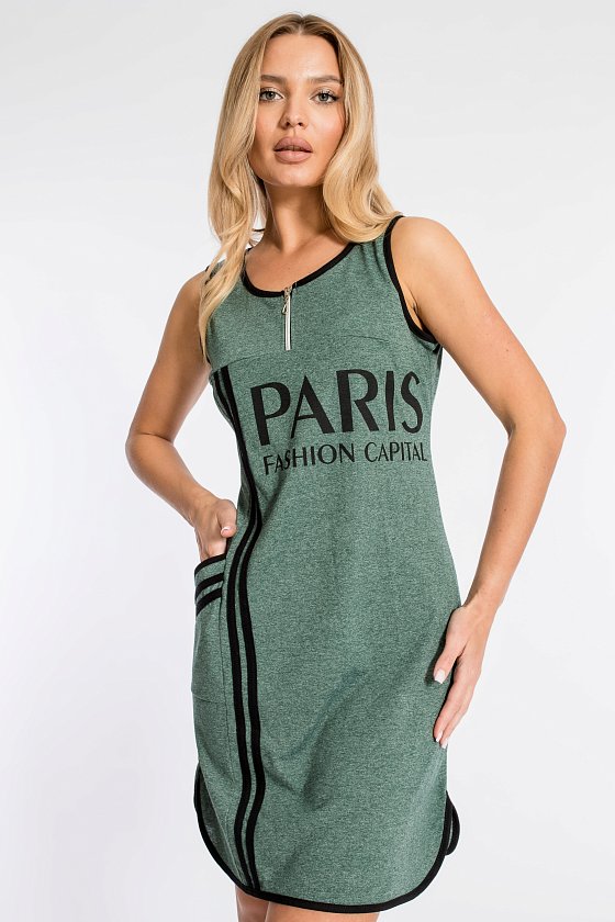 Сарафан молодёжный выполнен из однотонного хлопкового полотна. Круглый вырез горловины и закруглённый низ изделия с разрезами по бокам, оформлены бейкой. Спереди, в качестве отделки принт и кокетка с молнией, лампасы. С левой стороны размещён карман.