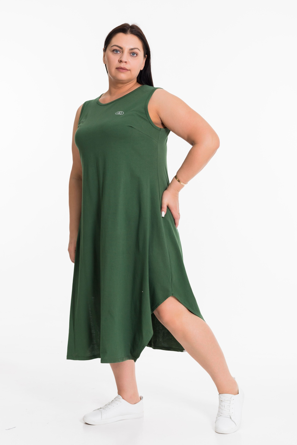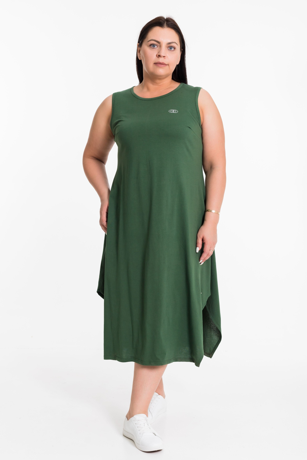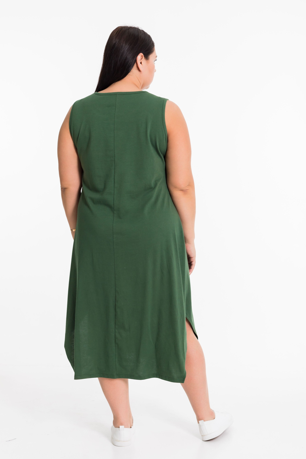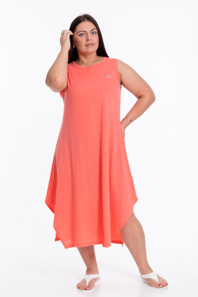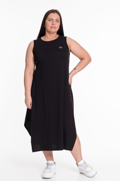 Сарафан из однотонной кулирки. На спинке средний шов, на полочке нагрудные вытачки и принт. Низ сарафана расклешен, по боковым швам скошенные разрезы.