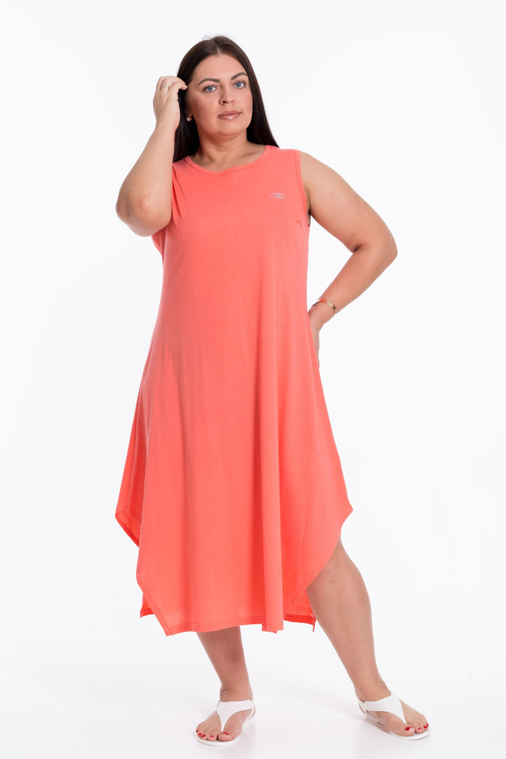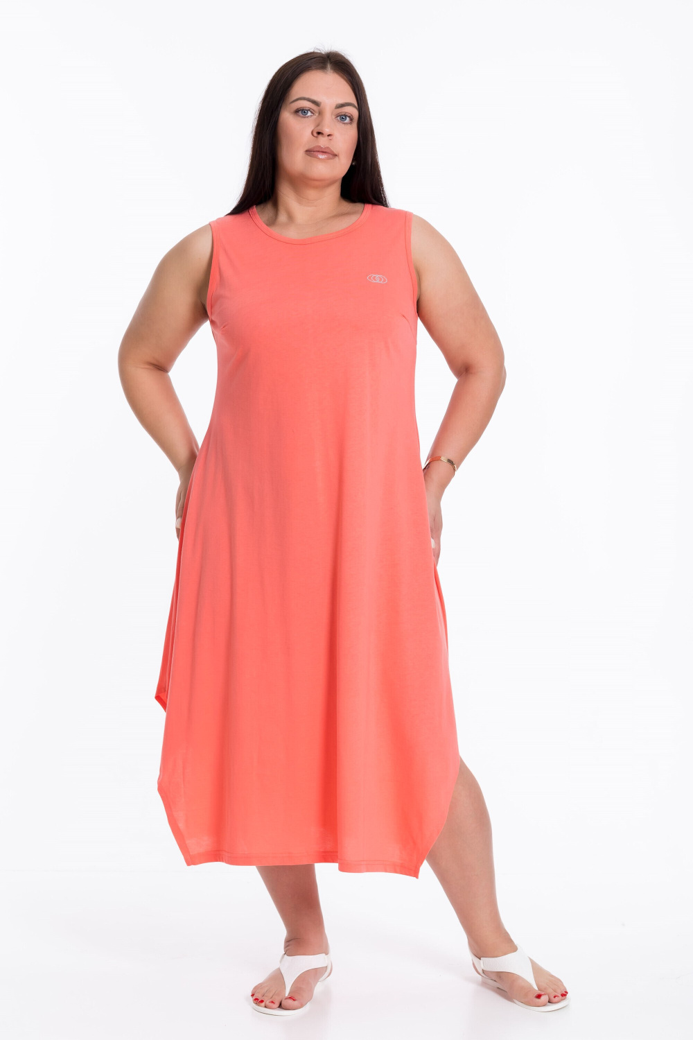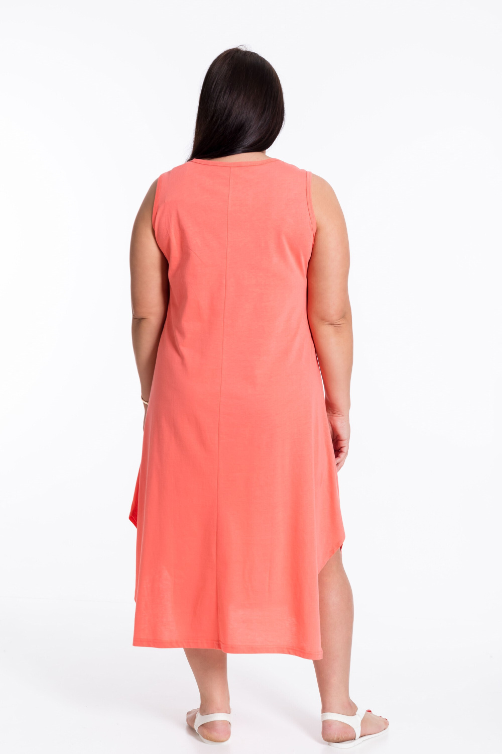 Коралловый стильный женский сарафан — отличный выбор для тёплого времени года. Изготовлен из лёгкой и приятной к телу ткани — однотонной кулирки. На спинке средний шов, нагрудные вытачки на полочке и расклешённый низ придают сарафану женственный силуэт. Боковые разрезы добавляют модели изюминку. Идеальный вариант для прогулок или отдыха.